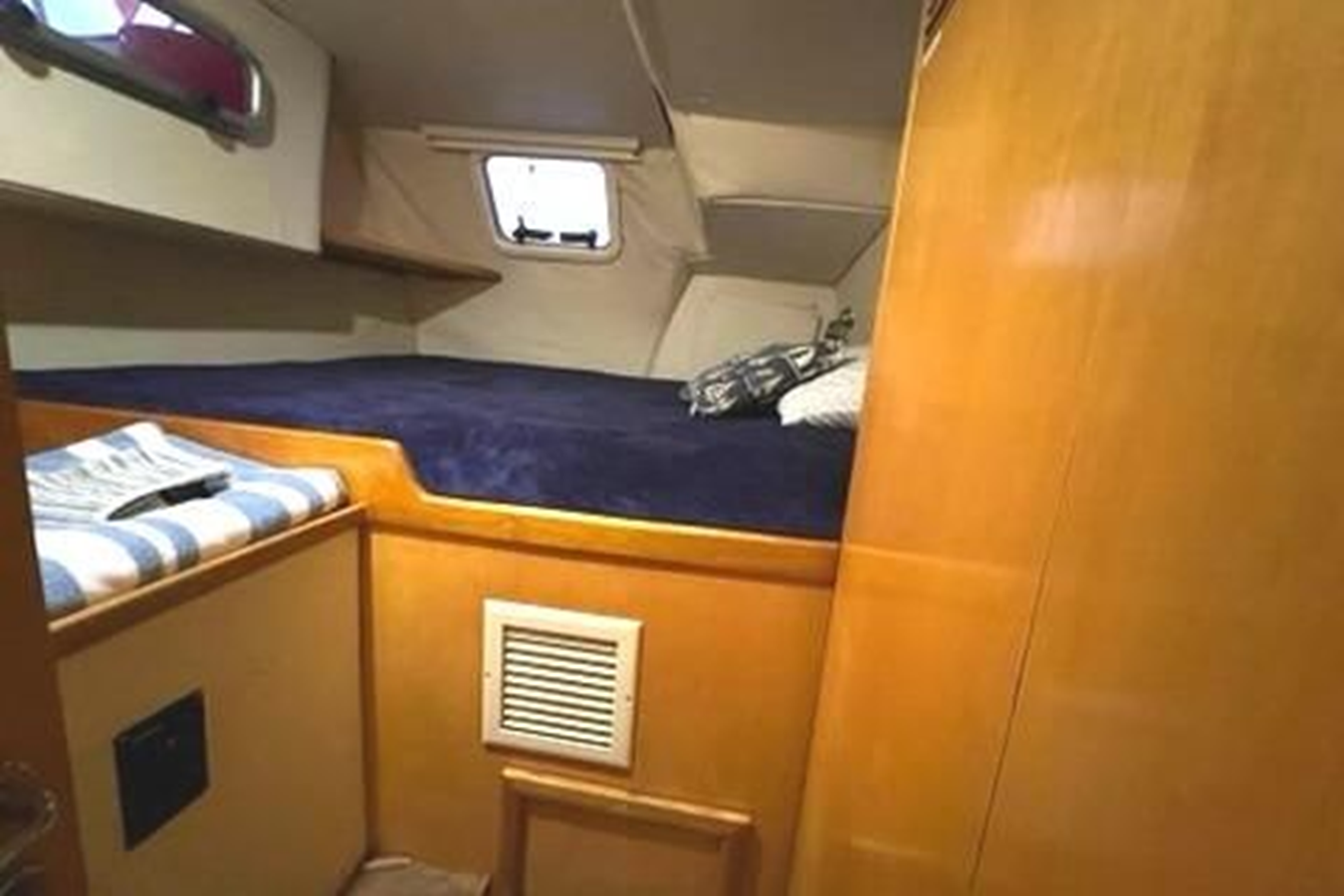 Port side hull: Aft section contains the engine, guest berth, refrigerator, chest freezer, storage cabinets, forward owners berth, and a full sized head with shower stall.