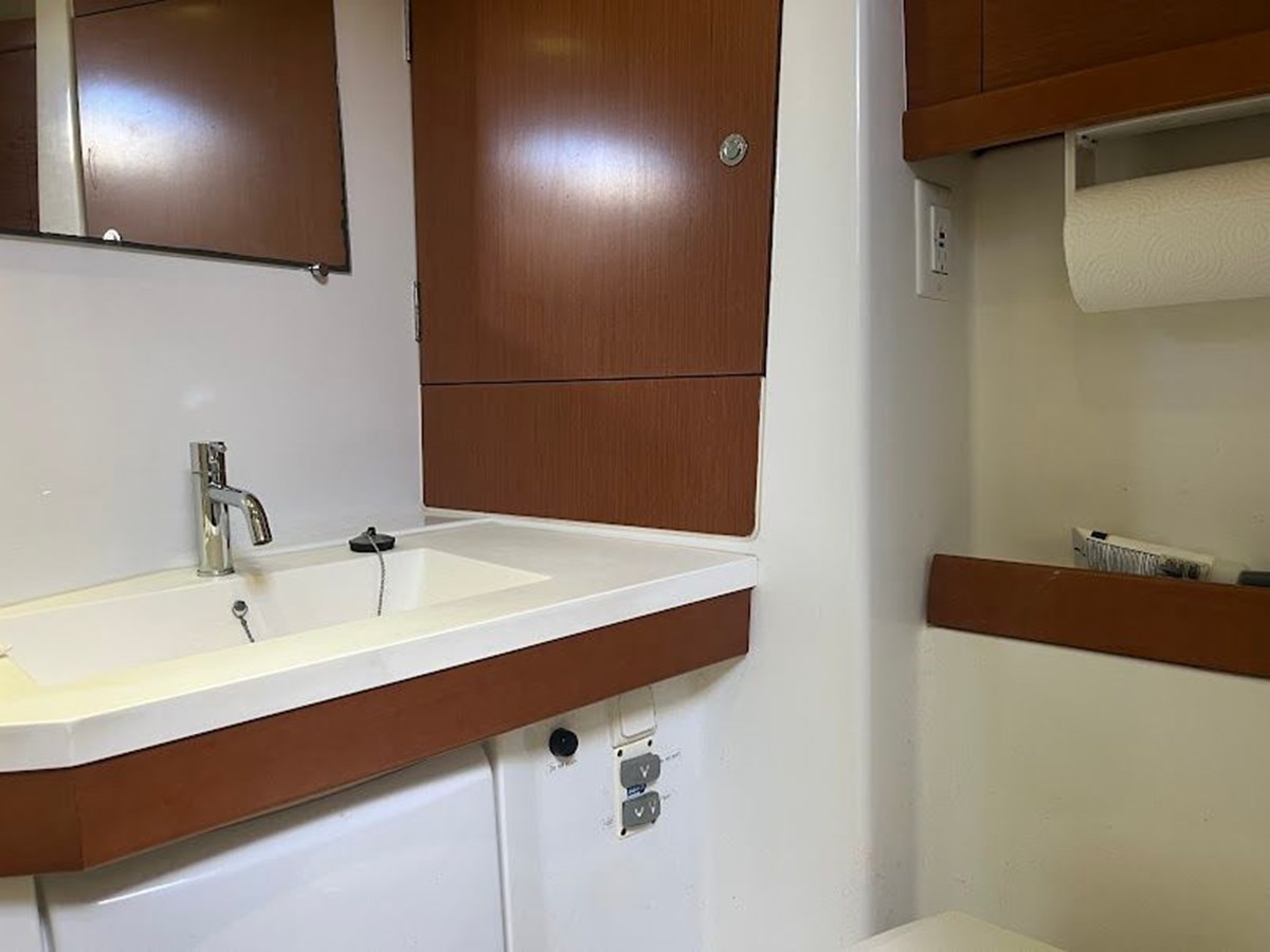 Aft master cabin: The second stateroom is located in the aft section, featuring a queen-sized berth positioned laterally. It has its own private head with a separate shower that has a second door, allowing it to be used as a day head.