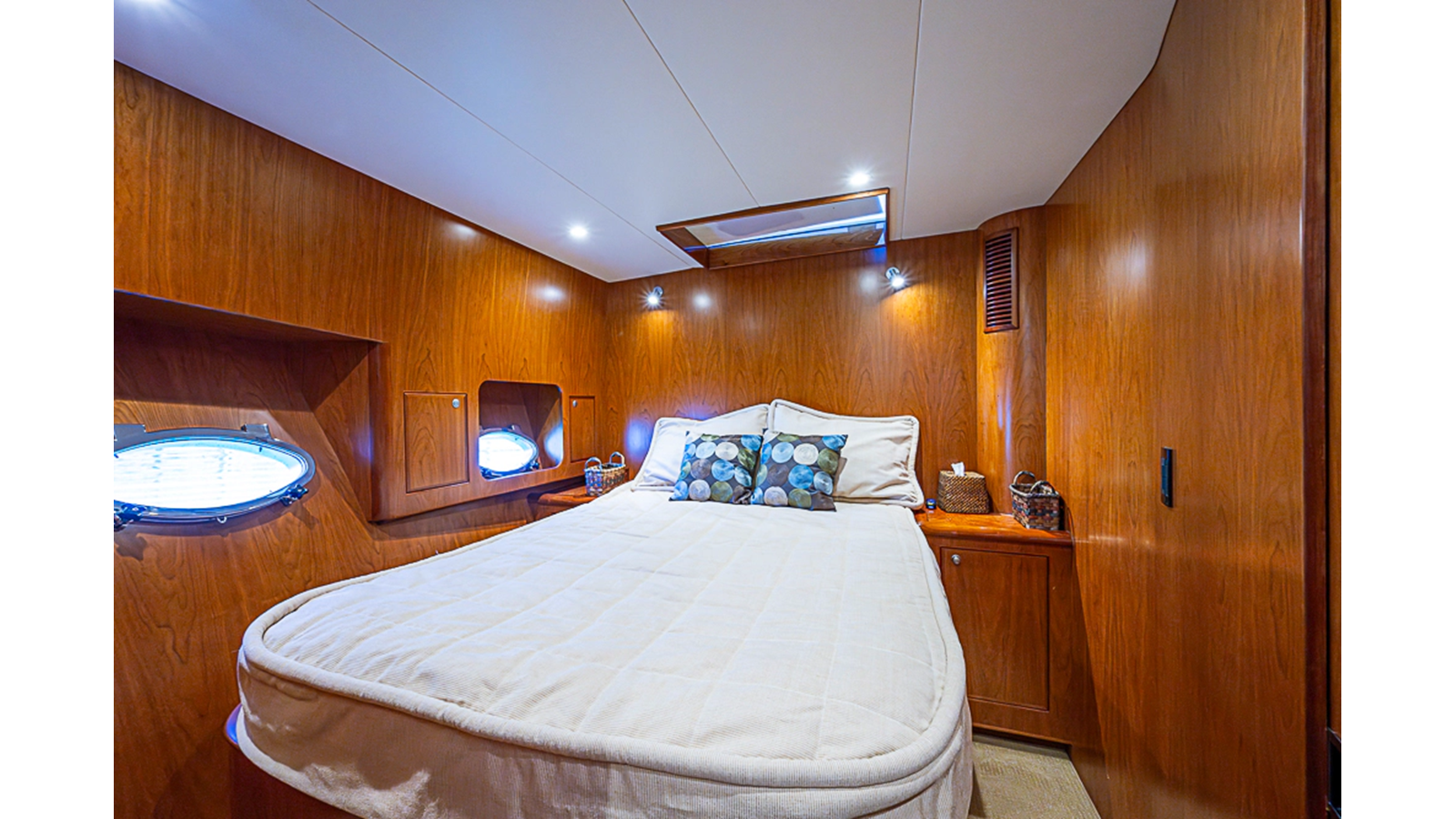 - Sliding overhead hatch covers at master and guest cabins