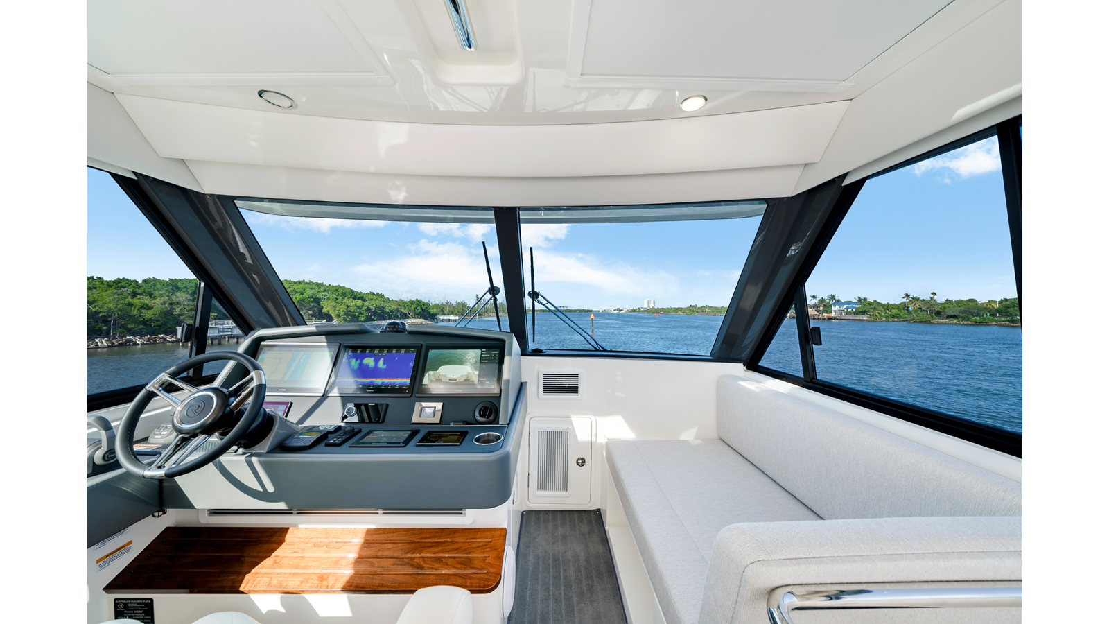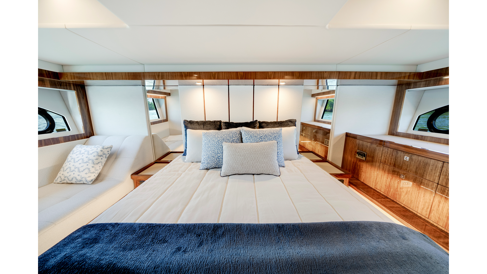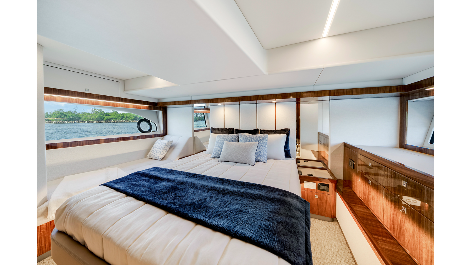 Designed by 4D Designs in collaboration with the Riviera design team and built in-house to our exacting standards on Australia’s Gold Coast, the new 50 Sports Motor Yacht is a remarkable package. Offering all of the essentials you’d expect to find on a much larger yacht, including foredeck relaxation zone, walk-around side decks, all-weather alfresco mezzanine entertaining, spacious luxurious saloon with internal staircase to an enclosed air-conditioned flybridge and state-of-the-art helm. The generous three cabin/two-bathroom accommodation deck is bathed in natural light from tinted glass hull windows and features a magnificent full-beam master stateroom.