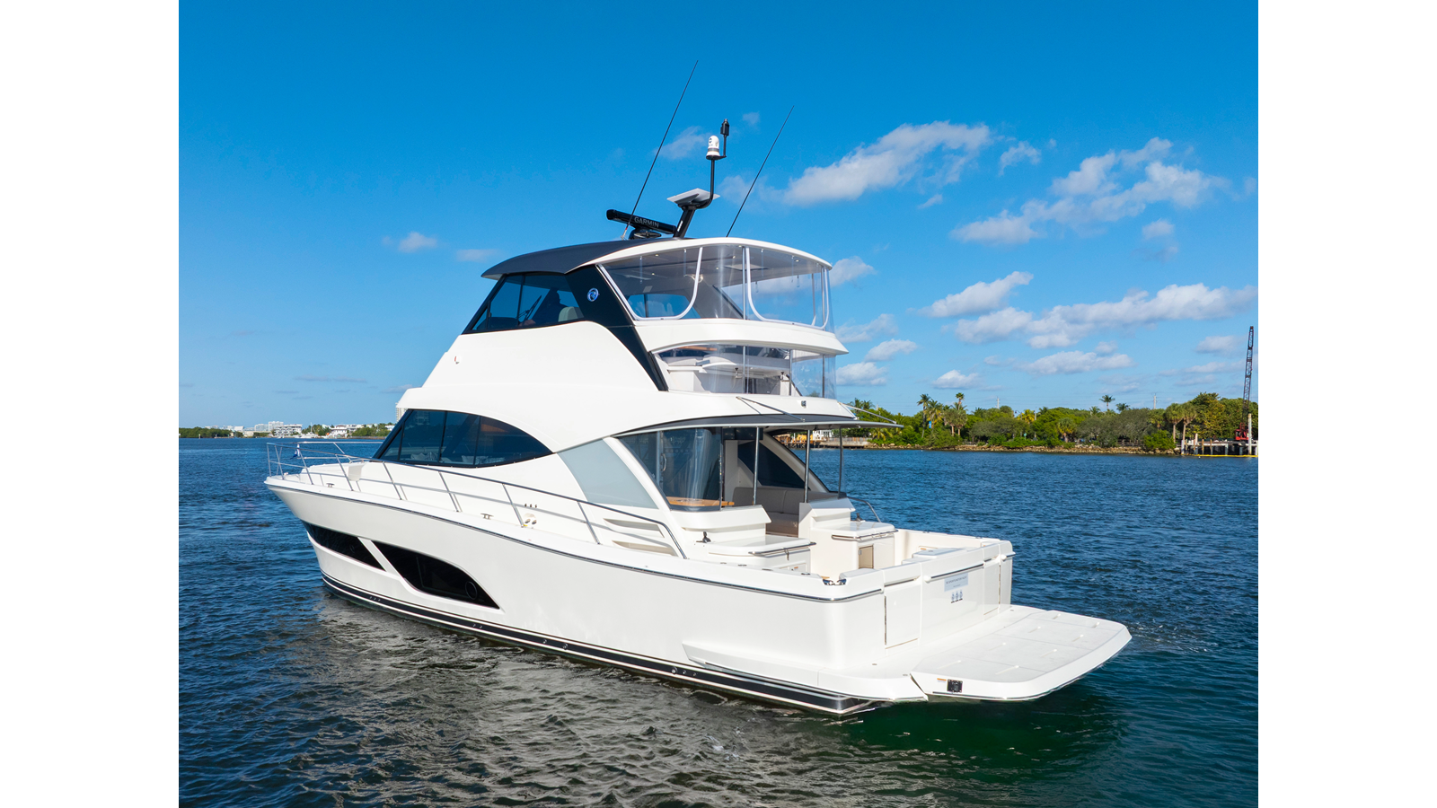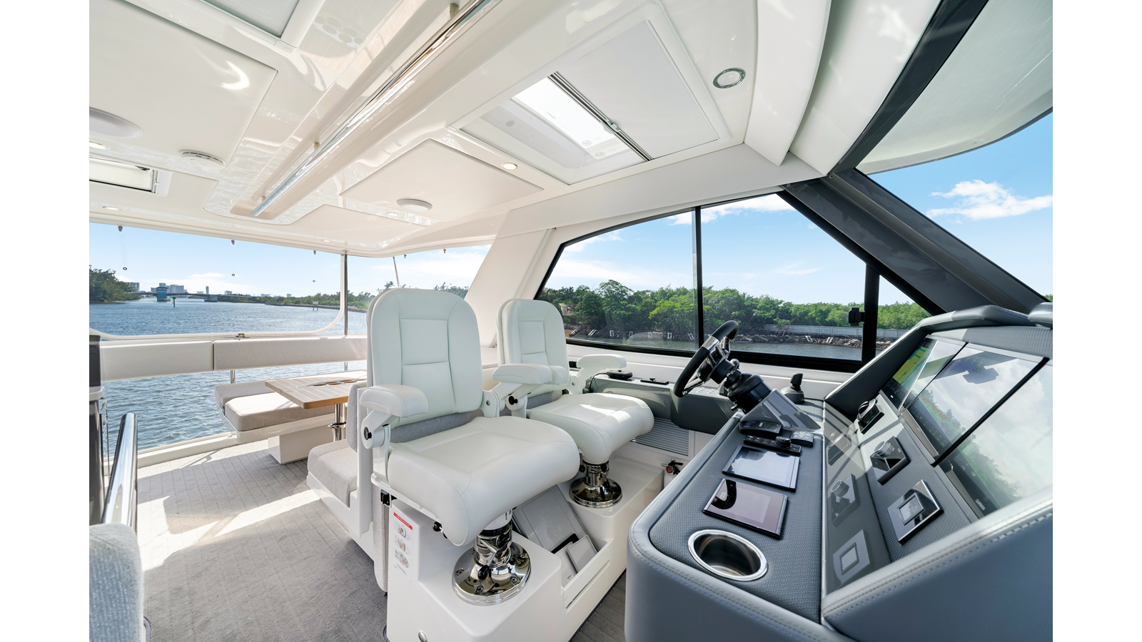 - Flybridge aft docking & fishing helm, Electric steering, S/S wheel inc. stop/start panel /dual lever engine controls, horn and dash cover