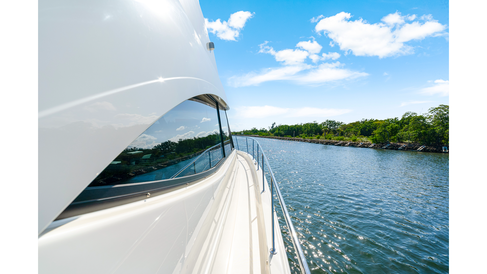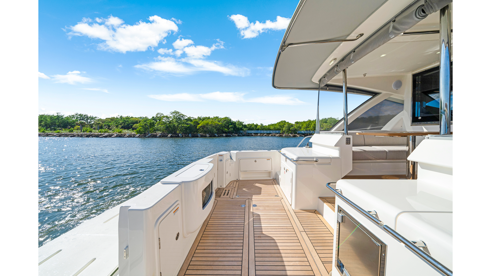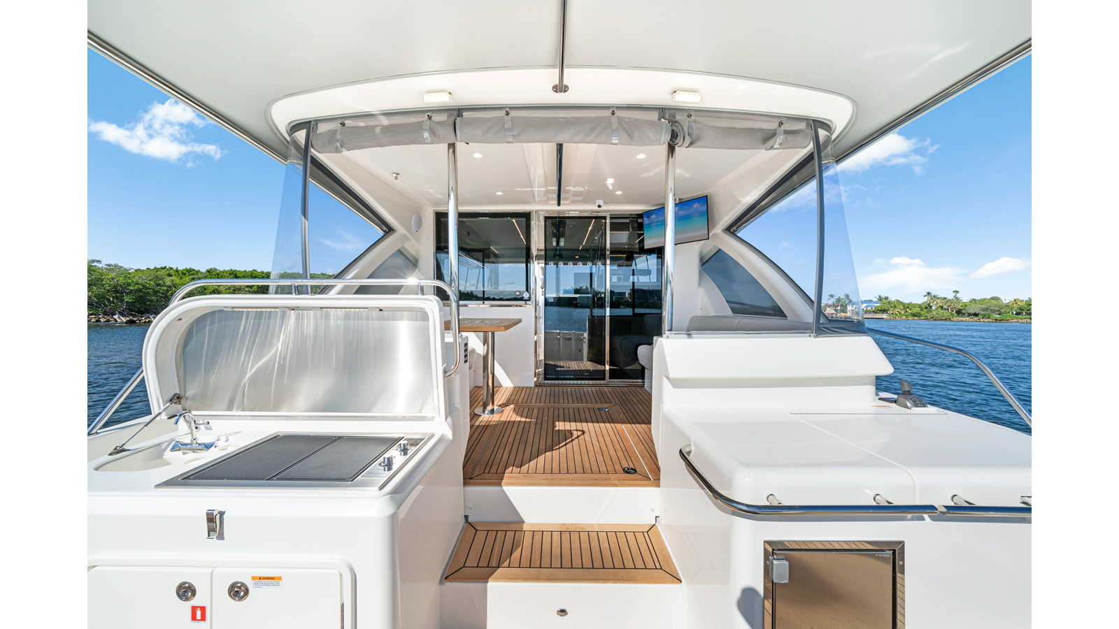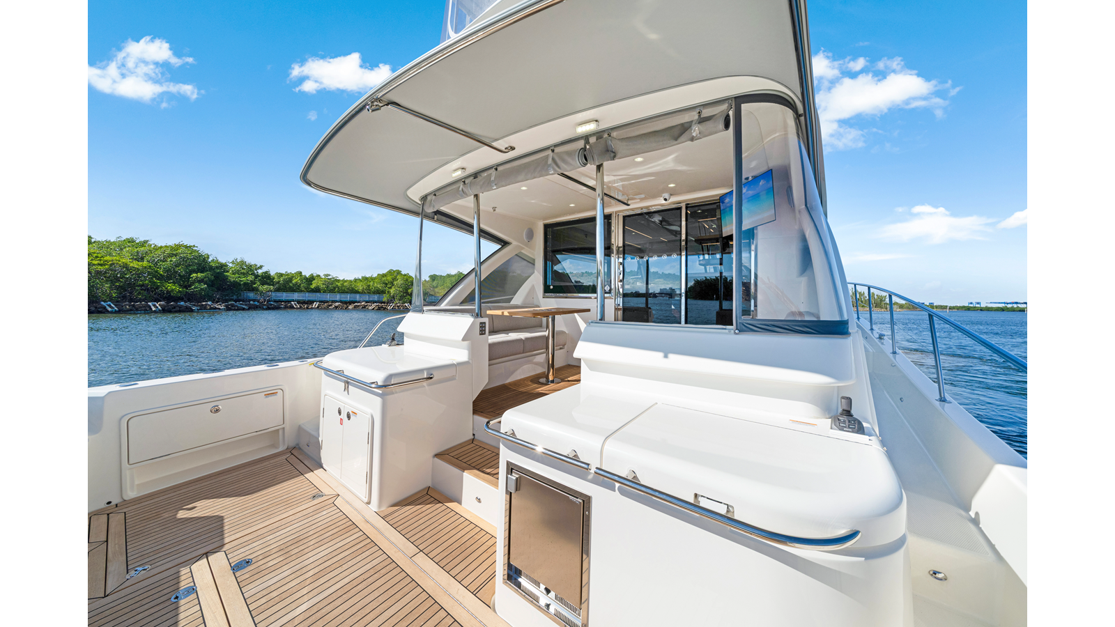 - Half rear cockpit awning (800mm from aft of Flybridge), including íxed, single bow stainless steel frame and acrylic canvas cover