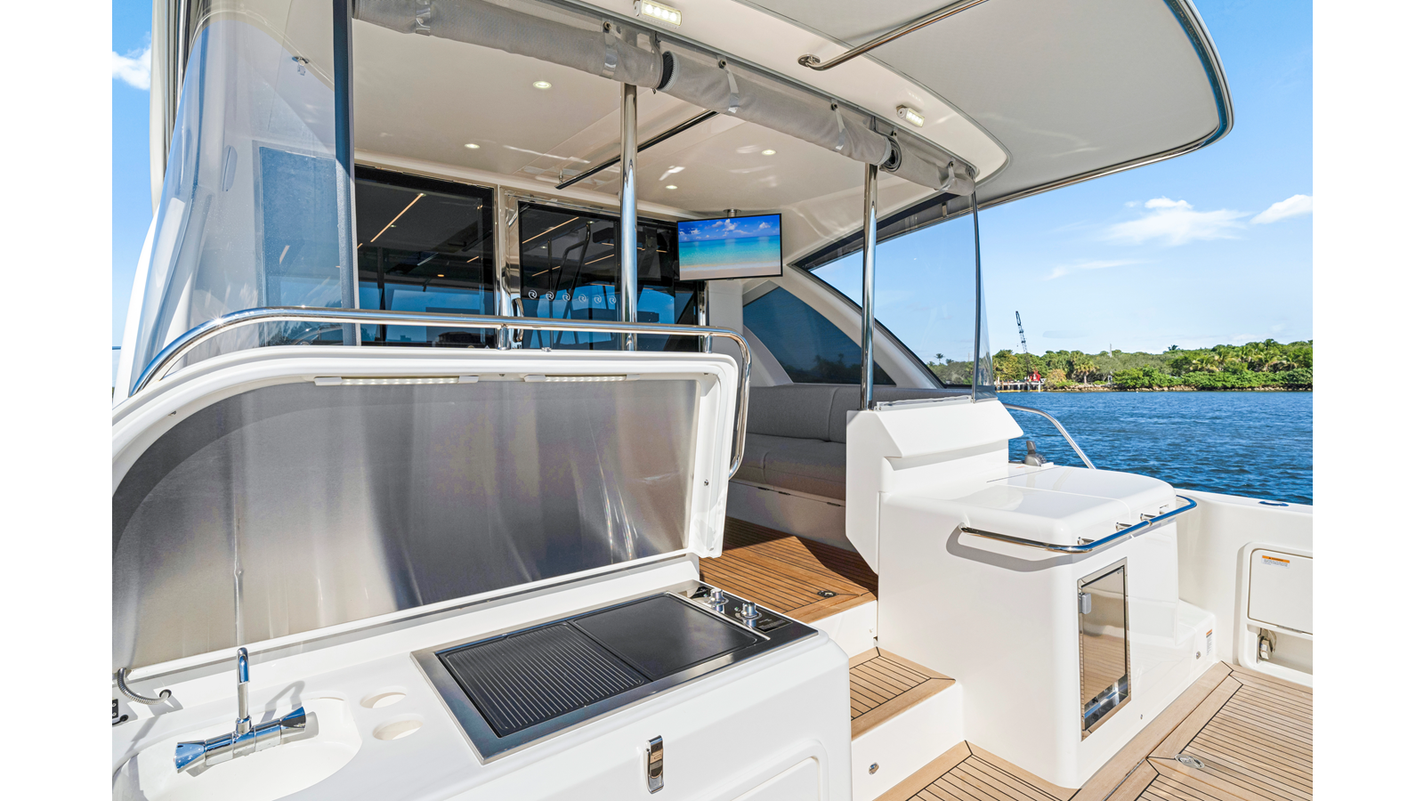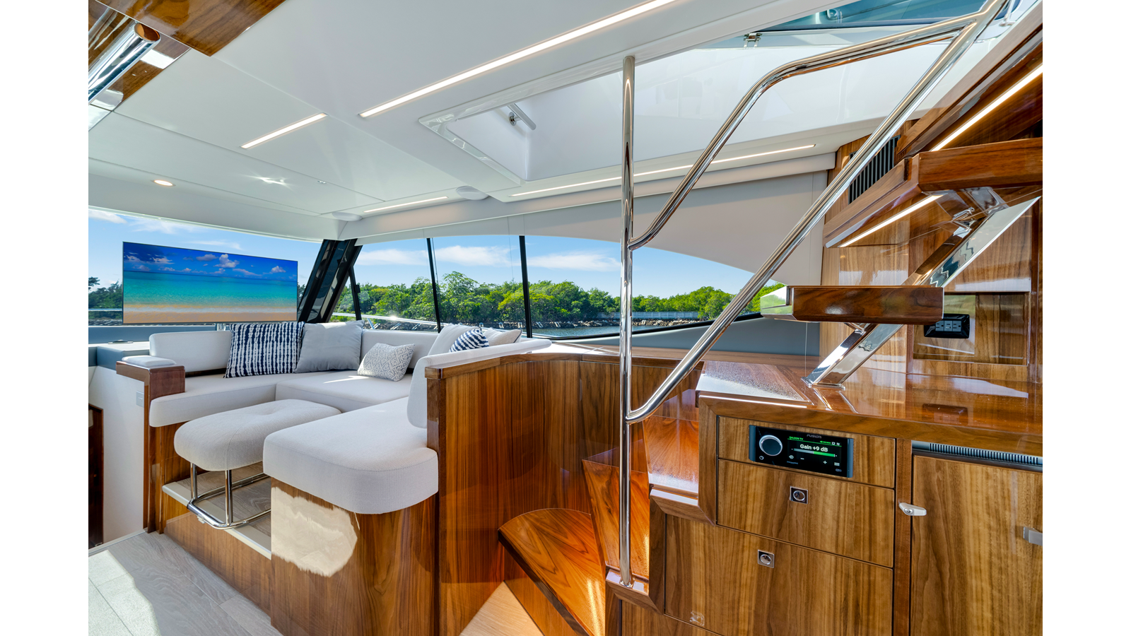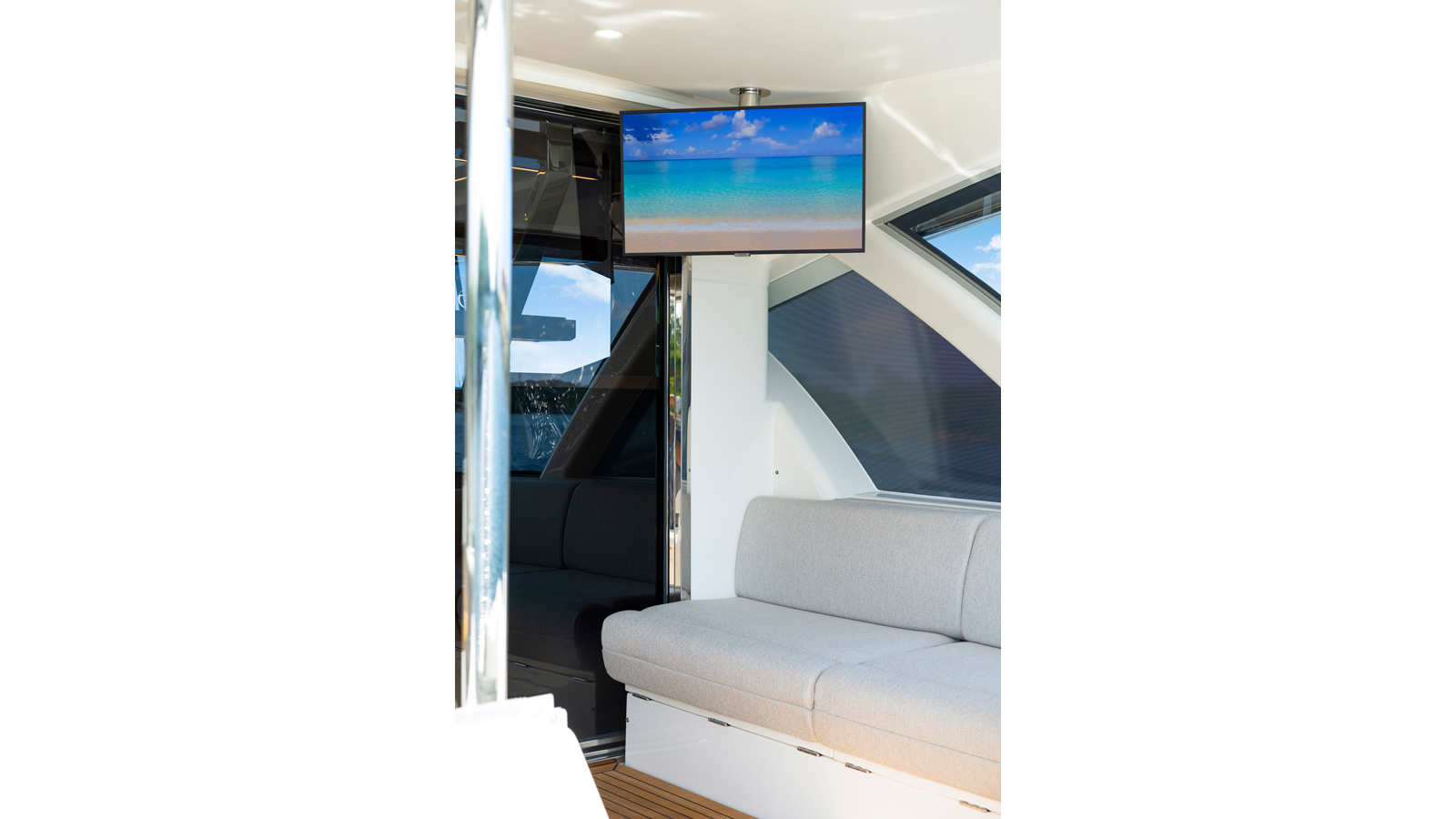 - Mezzanine - 32" TV mounted oì the hardtop stbd side mezzanine on a stainless steel mount, connected to cockpit speaker system