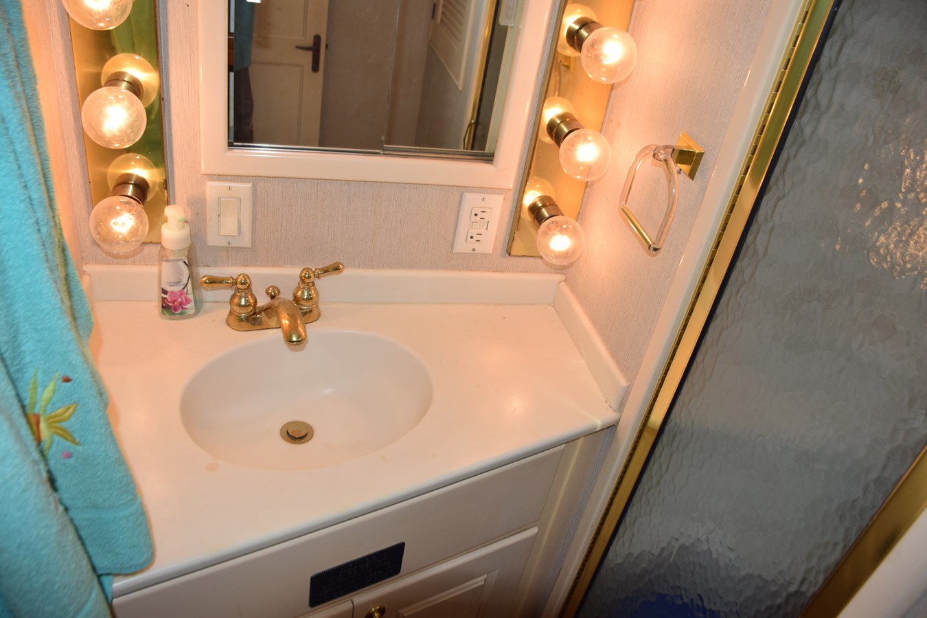 Across from the Galley is the companionway entrance to the guest head which has a separate shower stall with seat and a Kenmore stacked washer/dryer in a cabinet. White solid surface vanity top with bright lighting and mirror/medicine cabinet above, Teak and Holly sole. There is a separate door to the guest stateroom just aft on the starboard side.