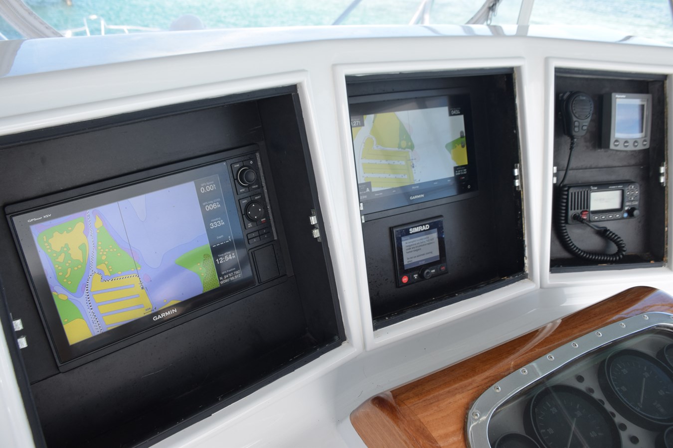 - FBG tower control box with wheel and single lever controls, compass, and VHF radio with external speaker