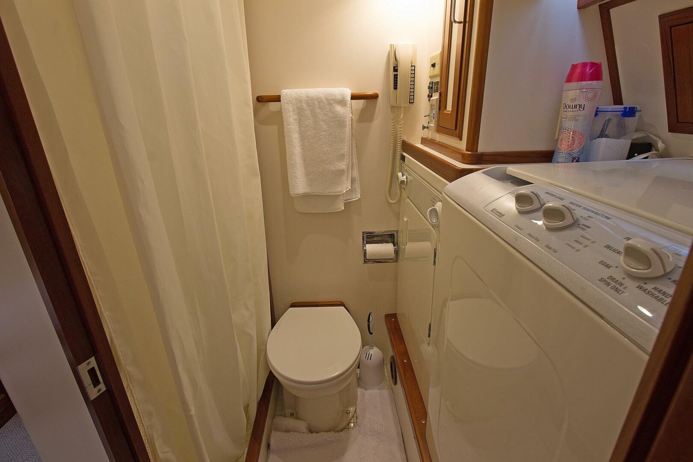 The aft stateroom can be found just two steps down from the salon stair passage and includes a large hanging locker. There is also a sink area with cabinet storage and mirror along with an ensuite toilet and shower. In the commode/shower section is the Kenmore washer and dryer. The queen size bed and storage drawers ensure that guests will enjoy their stay in comfort.
