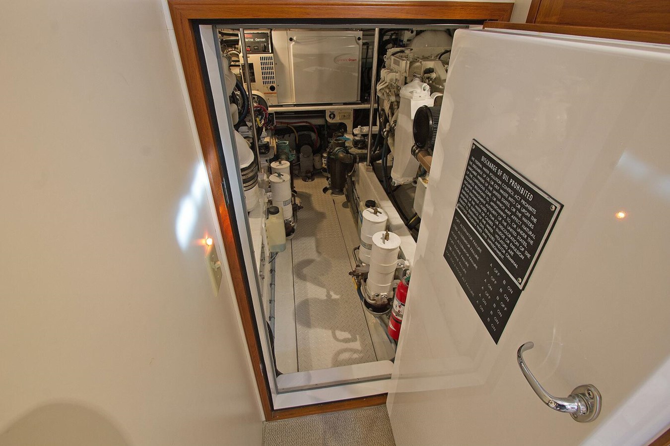 The engine room is accessed by a hatch in the middle of the aft deck. Additionally, nearly all of the aft deck is capable of unbolting and lifting off for unrestricted and non-invasive engine access. Once down below the engine room resides behind a latched, insulated door. The headroom and movement space is especially impressive for the engine room of a boat this size. Along with the convenient placement of components for easy maintenance, routine checks, and service; this engine room is a pleasure to be in. Equipped with two Cummins 6CTA8.3 diesels, 480 hp with V-drive transmissions, this Dettling is not shy on power and can achieve a high cruise of 16 knots and a max speed of nearly 27 knots.