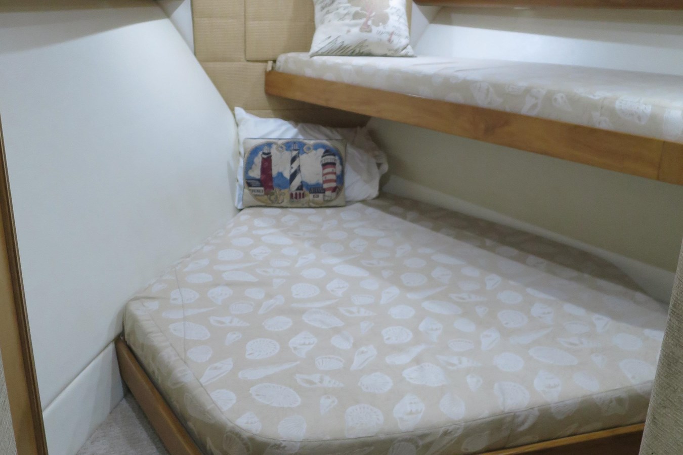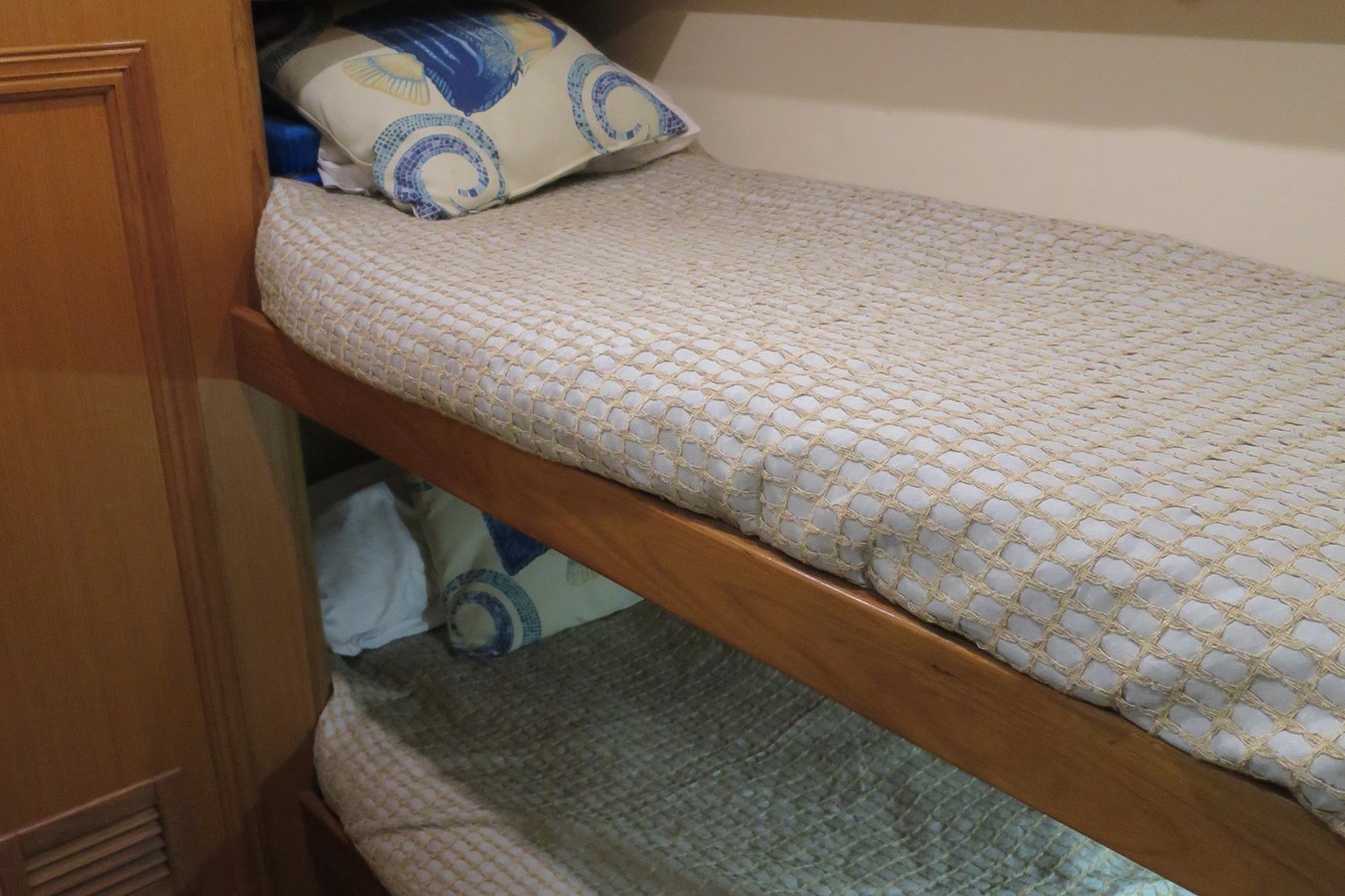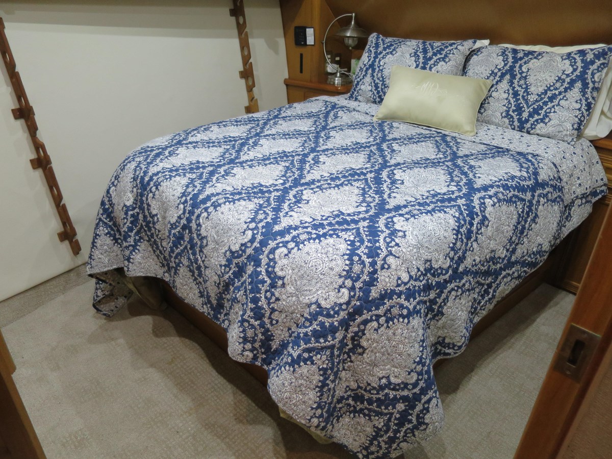 Highlander features a spacious three stateroom and two head layout. Beginning forward is the VIP suite with a double berth down and single berth up, hanging and drawer storage, next aft and to port is the guest head with a separate stall shower, next is the washer and dryer then the upper and lower guest stateroom.