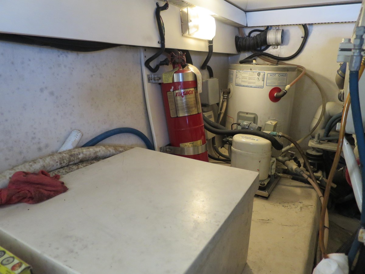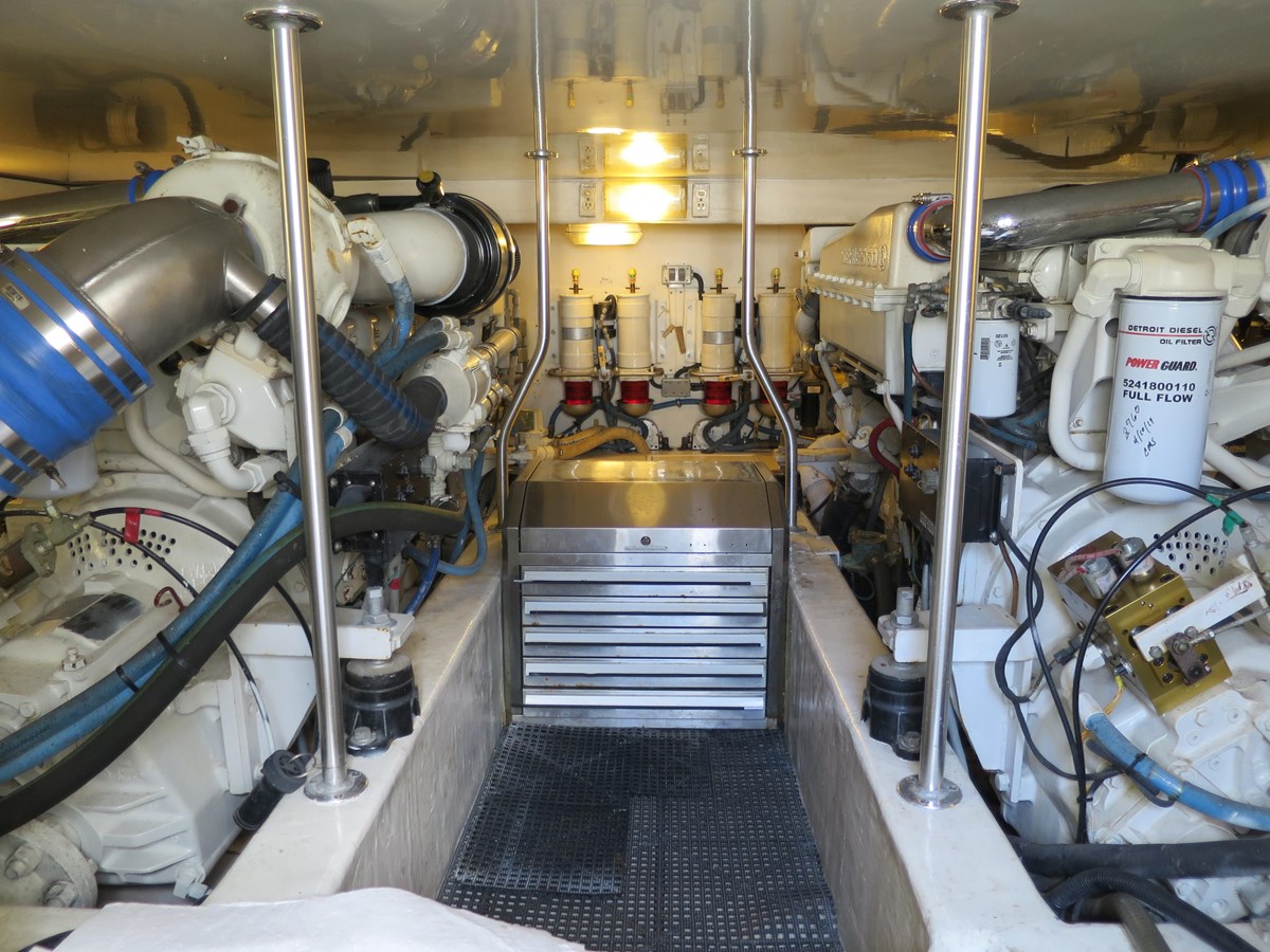 Twin DDC/MTU 60 Series 825hp diesel engines with 2900 hours, Airsep air filter system, Twin Disc marine gears, Hynautic engine controls, Oil X-Changer oil change system, dual Racor 1000 fuel filters with vacuum gauges and indicators, Stewart Warner fuel primer pumps, Racor R20 generator filter with AlgaeX fuel magnet, four Cruisaire reverse cycle air condition systems with a total capacity of 48,000 BTU’s with the SMX II IR controls, Raritan Royal Flush head system, Hynautic steering, Tides dripless shaft seals, cockpit engine room access.