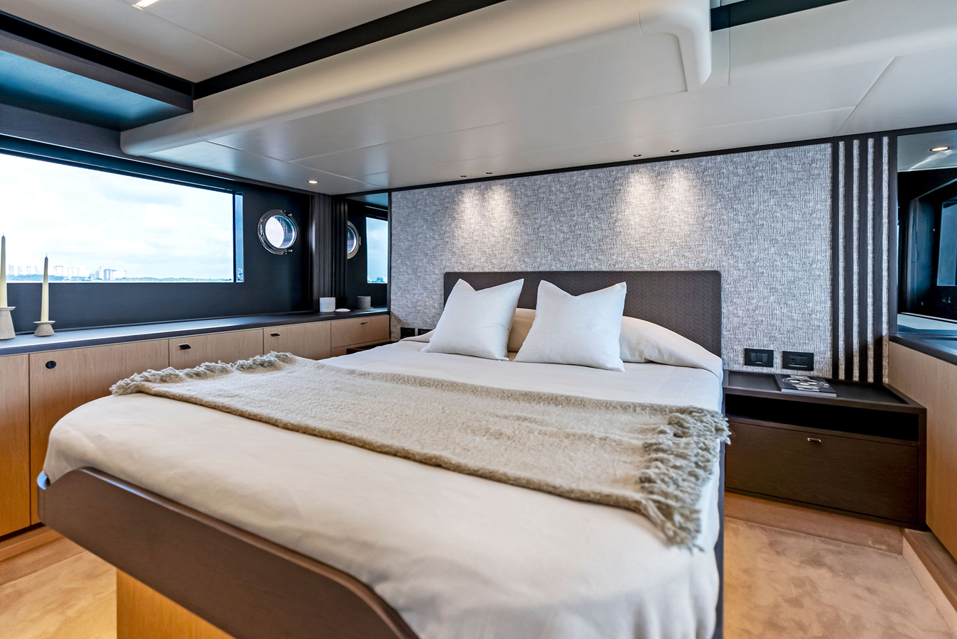 Inside, the salon features large panoramic windows, a fully equipped galley, and contemporary finishes that enhance natural light and openness. Below deck, the layout includes a full-beam master cabin, a generous VIP cabin, and a versatile third guest cabin, offering comfortable accommodations for extended cruising. A separate crew cabin is accessed from the swim platform.