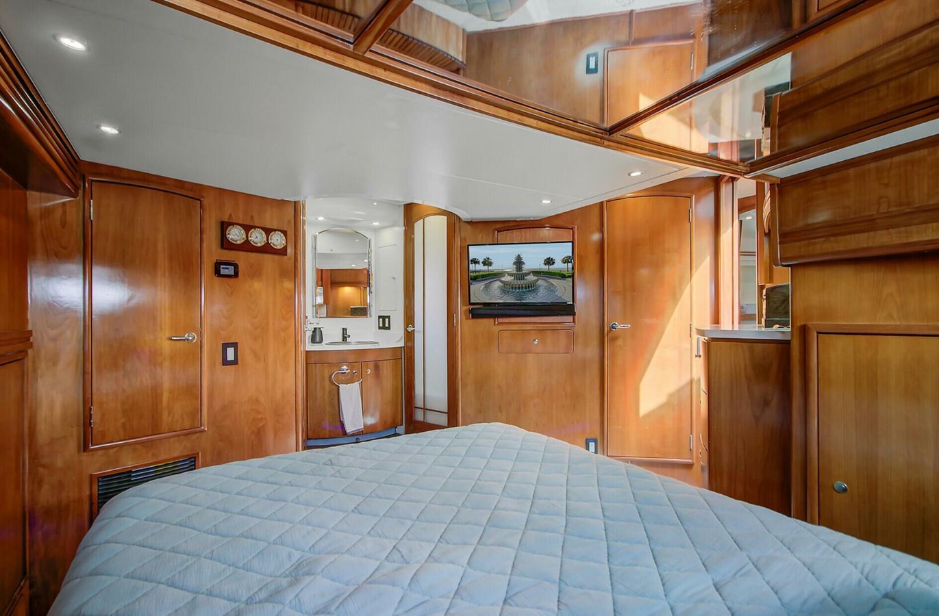 No Surrender was kept under cover on freshwater lakes in Texas for nearly 23 years and looks fantastic for its age. The owner replaced the flybridge upholstery and updated the interior with high-quality finishes, including flooring, new carpeting in the cabins, stone counters, new appliances, and custom teak woodwork.