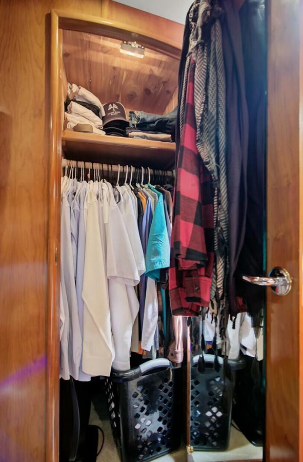 The full beam, midships master stateroom provides a luxurious retreat with ample storage, an en-suite head, and a washer and dryer. Guest staterooms are equally comfortable, offering well-appointed spaces for family or friends. Multiple heads contribute to the overall convenience of the layout.