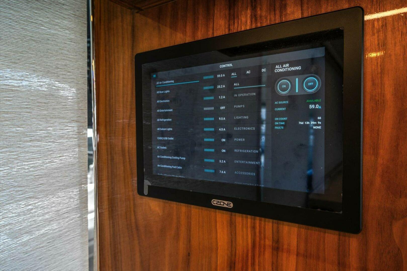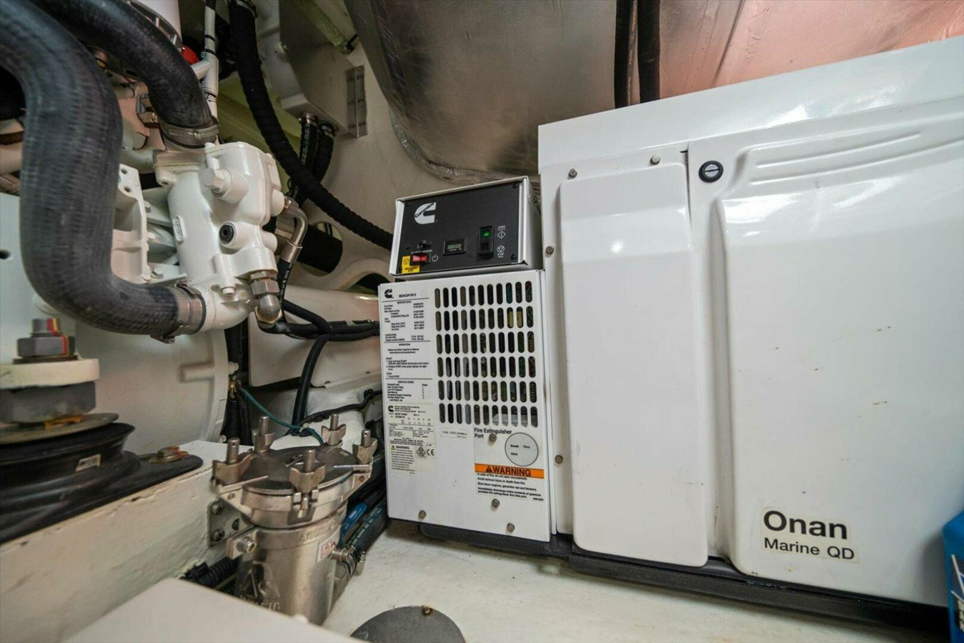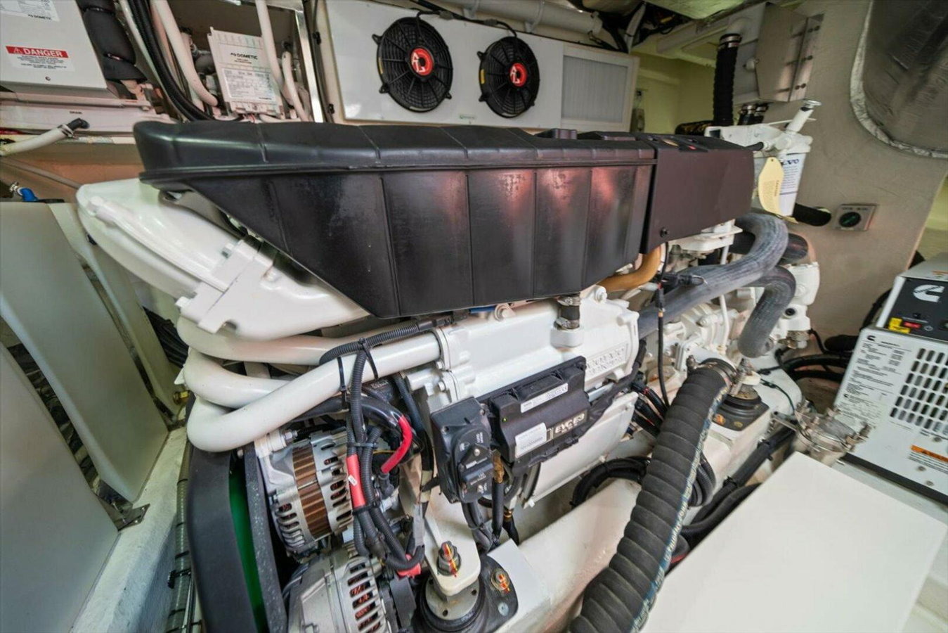 ELECTRICAL Alternators - Independent start bank and independent house bank (total x 4) Alternators - Port alternator charges start bank, secondary port alternator charges auxiliary bank. Starboard alternator charges starboard start bank & secondary starboard alternator charges house bank. Batteries (Maintenance free) - Independent port & stbd start (total x 4), Auxiliary (x2)& house 24V x 3 (300AHr Total/210AHr Usable Li-Ion bank) Battery banks individually isolated Battery charger (24V/100A) for house bank Battery paralleling system for emergency engine starting Bonding system, to all metallic hull fittings under the water line with zinc anode including galvanic isolator Digital monitoring system including AC& DC power metering, fluid tank level monitoring & DC circuit status via 10'' colour LCD touch screen mounted at aft saloon and 5'' Touch control screen at helm Inverter 2.5kW to operate entertainment, 1 x Galley GPO and ice machine in the absence of generator or shore power Navigation lights (international standard) Wiring coded, numbered & assembled in looms where possible Generator - Onan EQD 21.5kW/60Hz with muffler, fresh water-cooled including sound shield, remove stop/start electronic & hour meter Backlit R Logos x2 fitted to deck sides