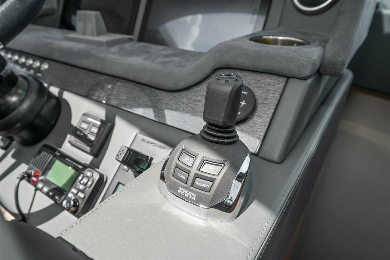 Volvo Penta Assisted Docking System with proportional bow thruster (new for 2023). Big game changer for joystick docking. The boat will maintain its fixed position but actively let you move it with the joystick all while counteracting wind and current.