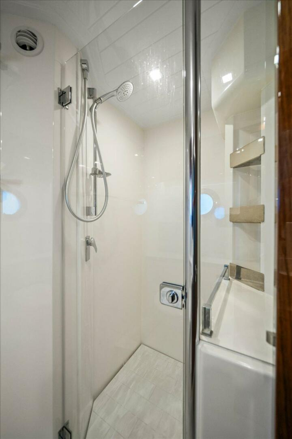 GUEST HEAD- STARBOARD Contemporary design, solid surface benchtop with above bench bowl sink and high quality mixer tap Entrance to starboard head from companionway & private ensuite from stateroom fwd Exhaust Fan Flooring - Corian to match benchtop selection with brick style pattern Hatch - white with screen and blind Mirror Overhead and vanity mirror lighting (DC) Shower stall with glass partition, frameless glass door, automatic sump pump and shower head (on slide bar) Storage locker with drawers under bathroom sink Toilet roll holder, towel holder and accessories Toilet, fresh water flush Vanity cabinet