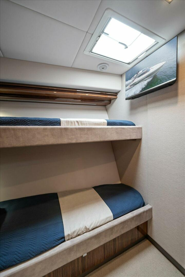 STATEROOM- PORT GUEST Air conditioning 6,000BTU with reverse cycle heat, split to head Berths, upper and lower (innerspring mattresses) with storage under Carpet with underlay Hanging locker with cedar lining Hatch - white with screen and blind Hull and head linings, vinyl covered with padding Private entrance door Reading and overhead lighting (DC), LED
