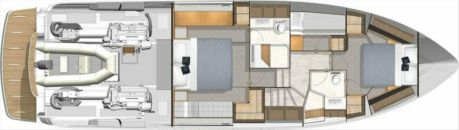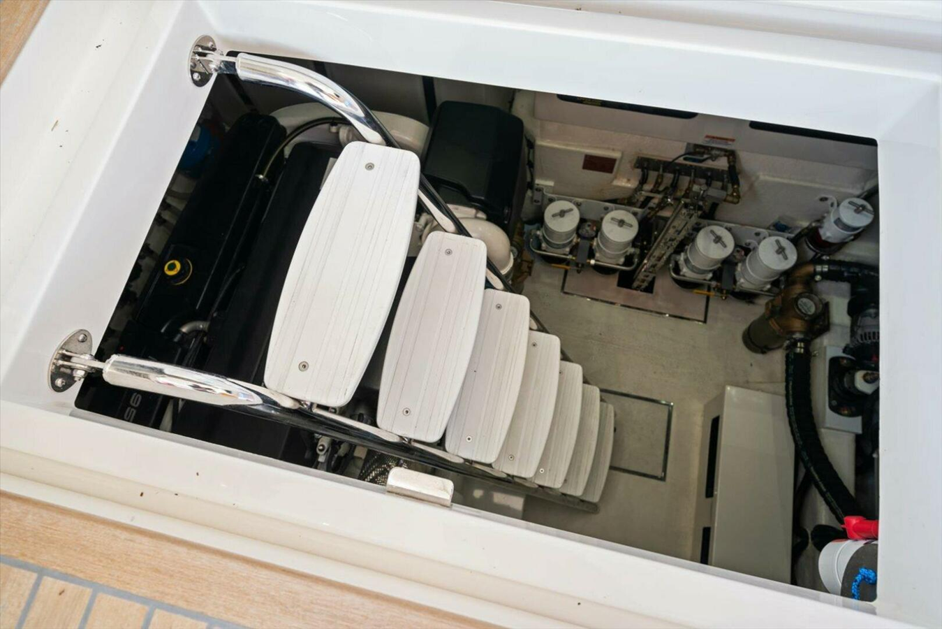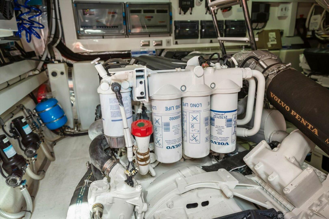 MECHANICAL Acoustic & thermal insulation to Engine room Air conditioning condenser units - (BTU's) 36,000, 16,000, 12,000 & 6,000 All through hull fittings on or below the water line fitted with ball valves, all hoses double clamped Bilge pumps, auto & manual override x 4 Engine hatches insulated & removable Engine monitoring display (Volvo) - 7'' Glass Bridge MFD Engine mounts - anti vibration Engine room lighting, LED (DC) External & internal seawater strainers for main water intakes - engines, generator &air conditioning Fire suppression system for engine room with automatic/manual controls Fresh water heater (AC) Fresh water pump, Secondary backup pump (switched independently) Fresh water system (pressurised) 2 x 400 litre tanks, total capacity 800 litres (211 USgallons)* (approx.) displayed in Czone Fuel lines all swaged Fuel shut-off valves Fuel tank, GRP coated in fire retardant resin, 3000 litres (792 US Gallons)*approx. displayed within Volvo Engine monitoring & visual site gauge on tank Holding tank capacity 400 litres (105 Gallons)*Approx. Sanitation system with overboard pump out switch & deck fitting for dock side pump out Tender winch, electric for tender retrieval Trim Tabs - Volvo trim assist system Venting dorade system for engine and air intakes & fans (DC)