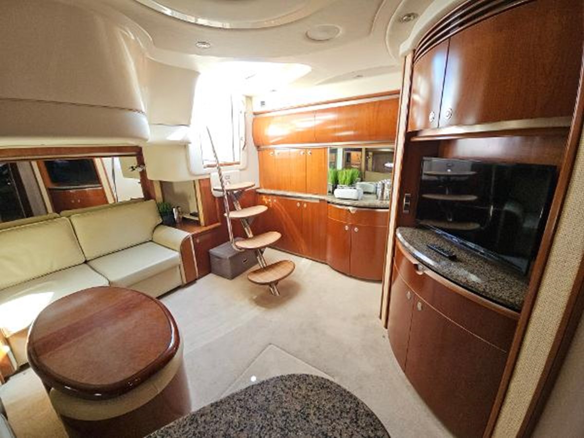 The spacious cockpit and transom have synthetic teak floors that look great without any maintenance. Additionally, it has new cushions in the cockpit and on the bow. On the port side is a wet bar with a sink and undercabinet refrigerator. Overhead is a flat screen TV.
