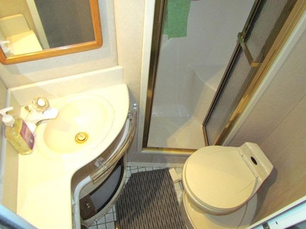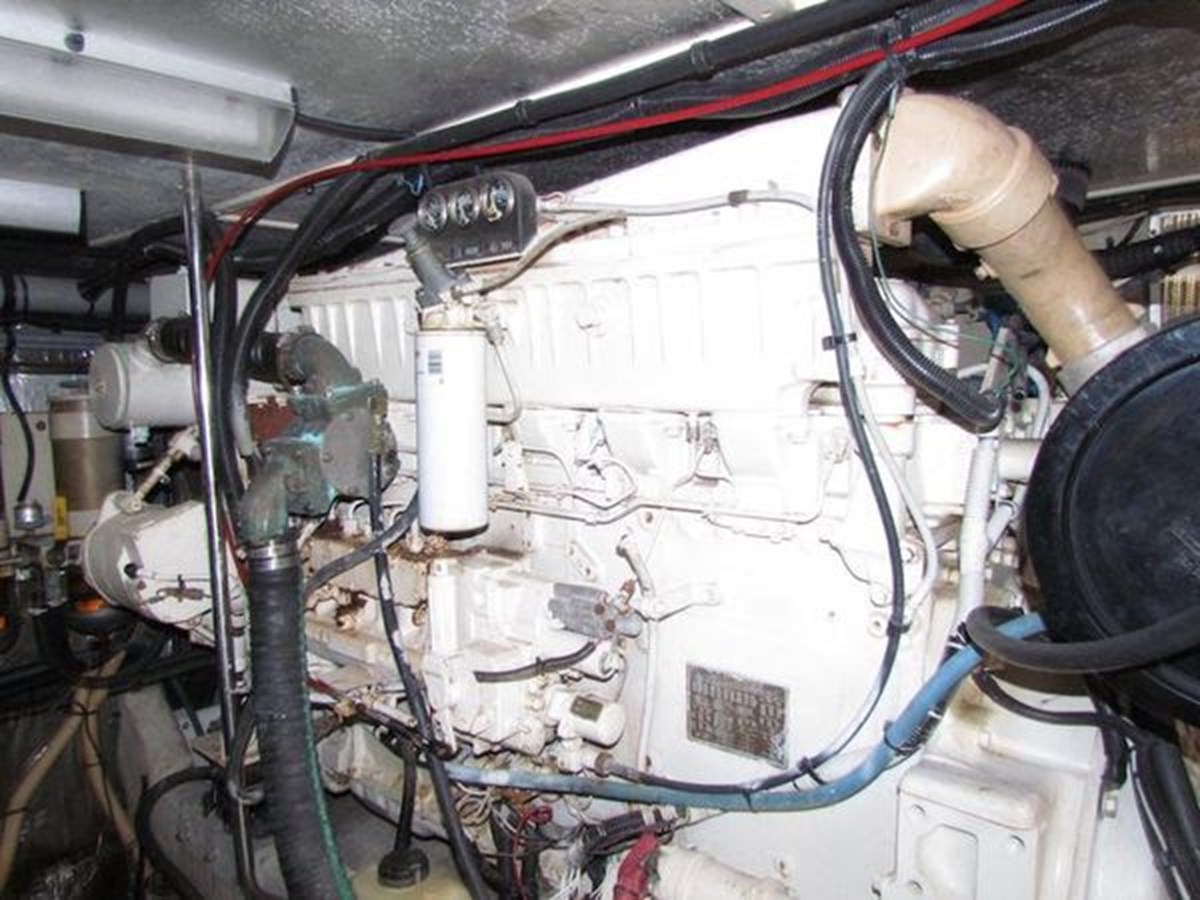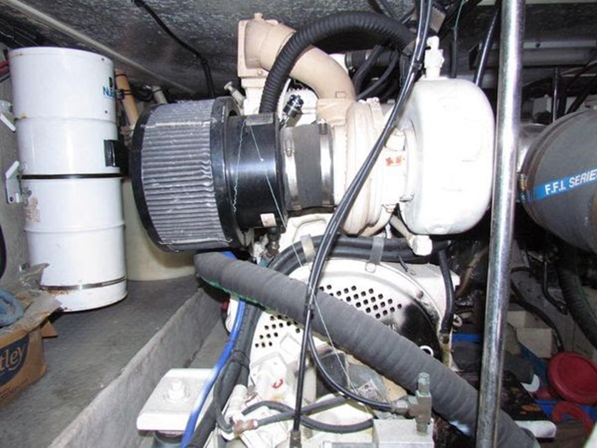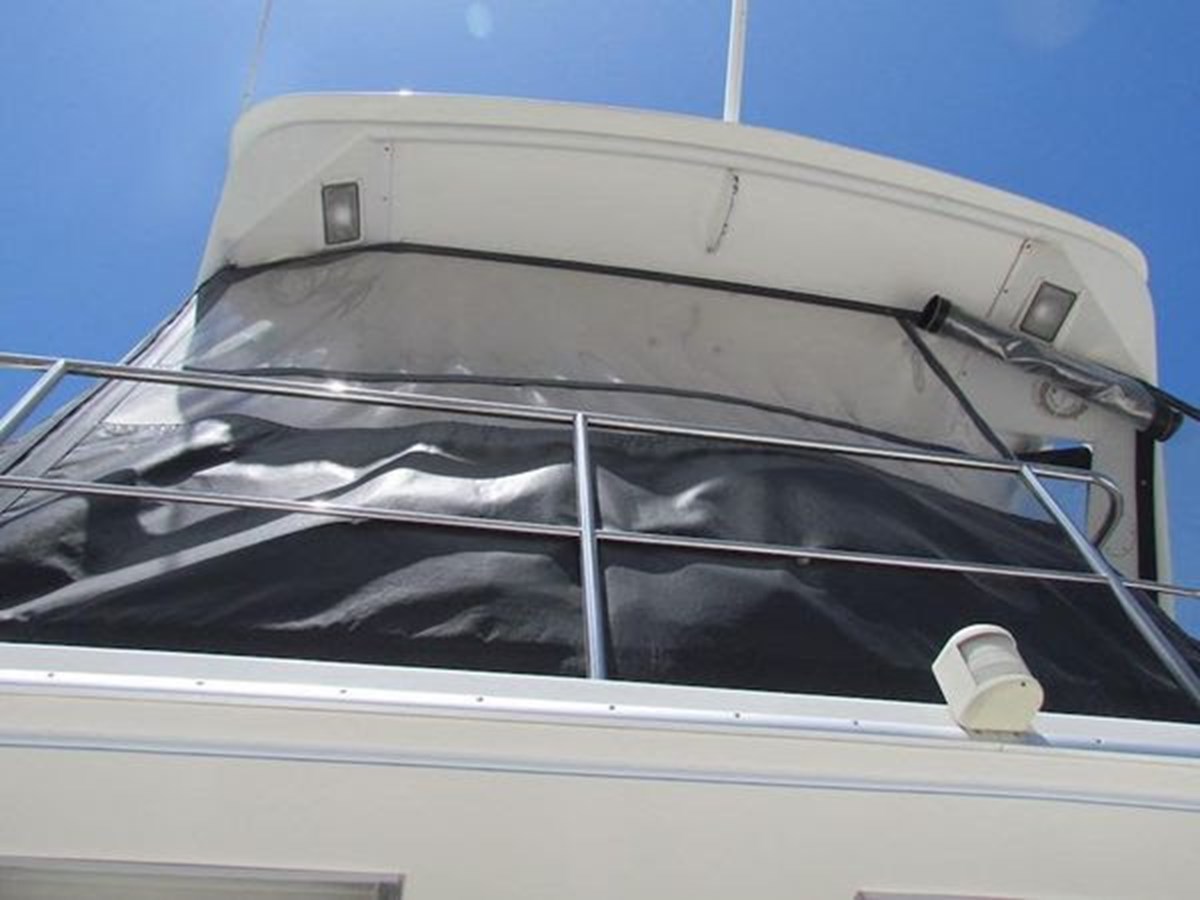 At the helm there are full wrap around plastic curtains, two helm seats, a Raymarine C120 GPS, autopilot, spotlight control, new VHF radio, engine controls and gauges. In the engine room there is a Westerbeke generator.