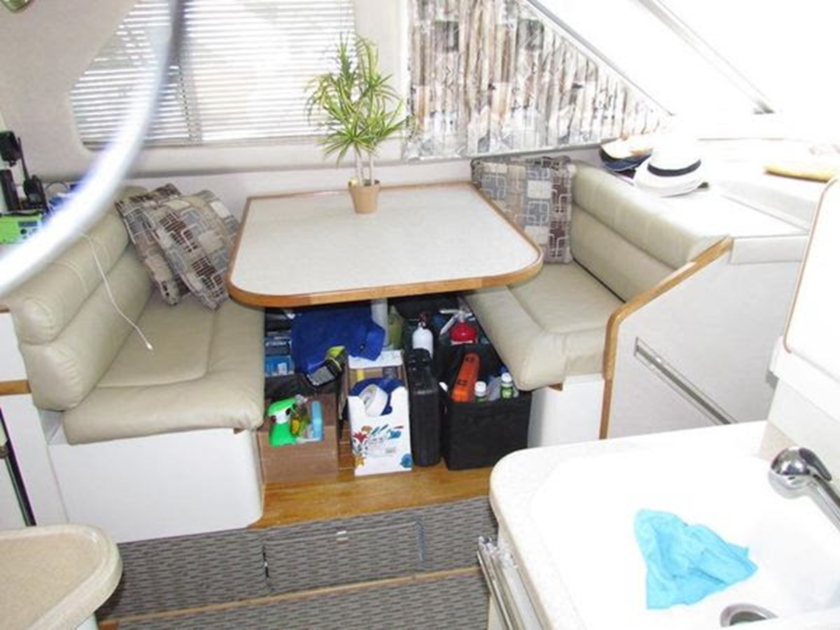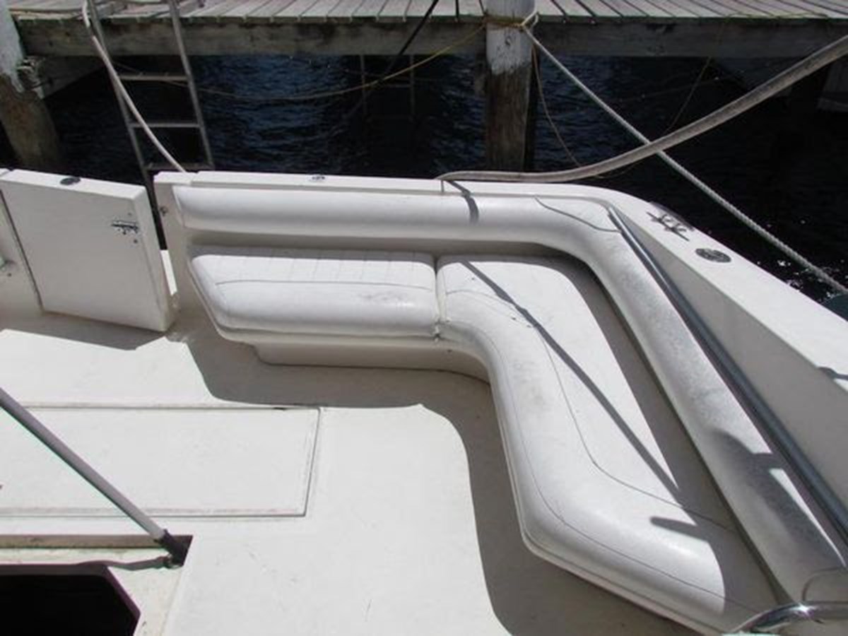 In the galley there is a three burner stovetop, microwave, spacious sink and fridge. In the salon there is a large L-shaped settee that has just been recovered. The spacious cockpit has lots of room for fighting fish and comes with two removable captains chairs and a table and an integrated swim platform with stainless ladder.