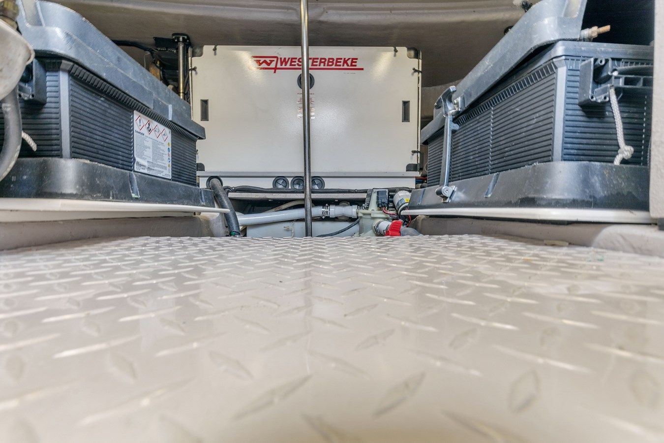 Cockpit, Self bailing fiberglass with gas assisted engine room service hatch & pivoting stainless steel engine room ladder