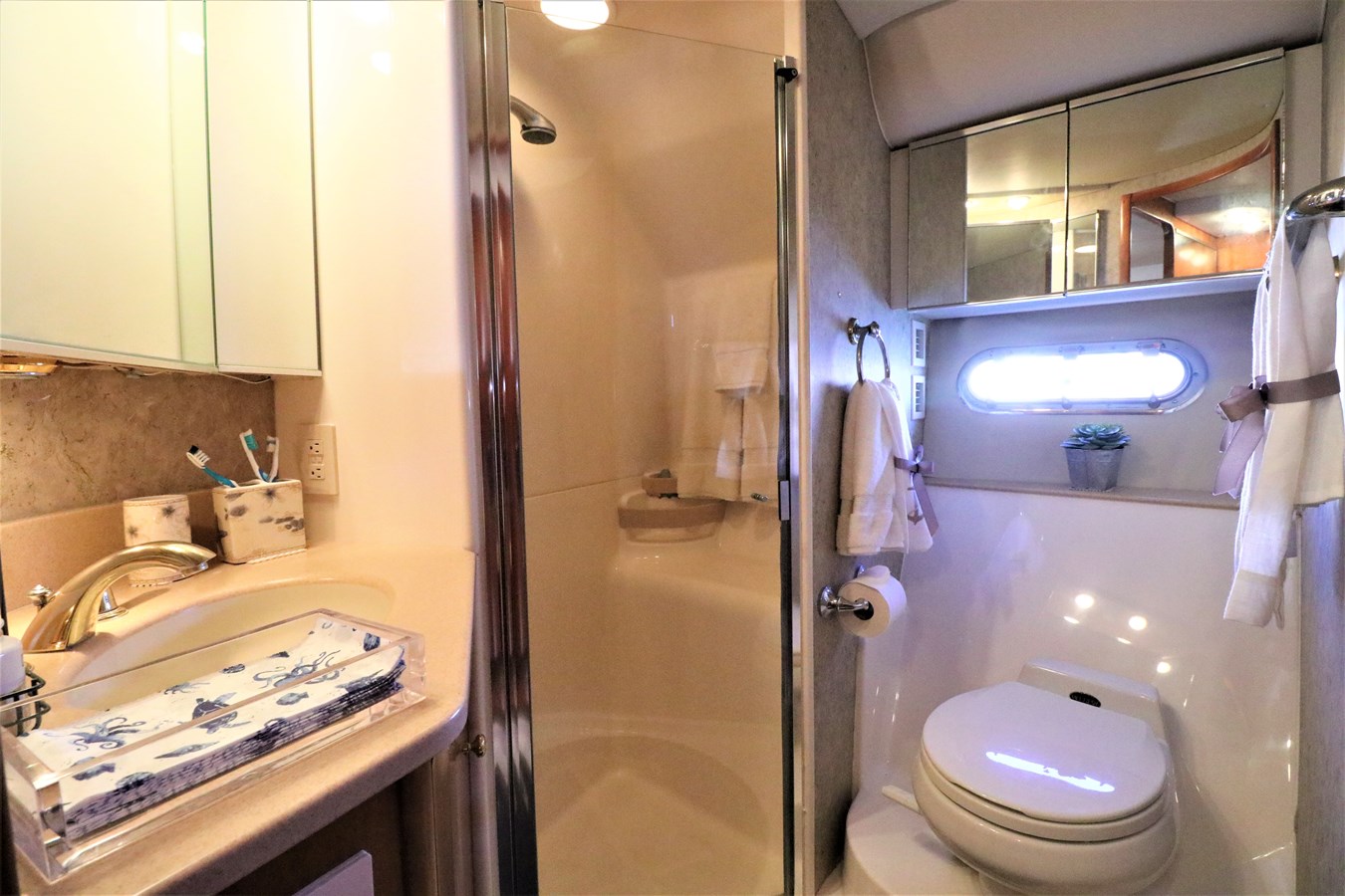 Up the starboard side steps to the help area with full control station, double Stidd helm sea, and large L-settee. The area houses a TV, wet bar, and refrigerator for your guests. Venturing forward and down the centerline stairway to the voluminous Salon and galley area. Although this is an express yacht, the lower Salon and galley have the space of a much larger yacht. Good-sized staterooms with their own heads make this a very comfortable yacht for long-term cruising.