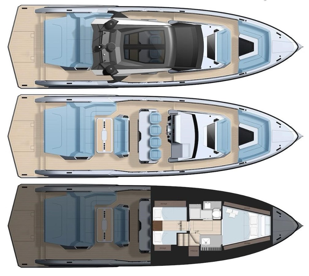 The hull and deck are engineered for strength and weight efficiency, translating into confident handling, efficient cruising, and strong top-end performance. The helm is purpose-built with clear sightlines and intuitive controls, while the deck layout emphasizes practical flow, secure footing, and well-positioned social spaces without sacrificing functionality.