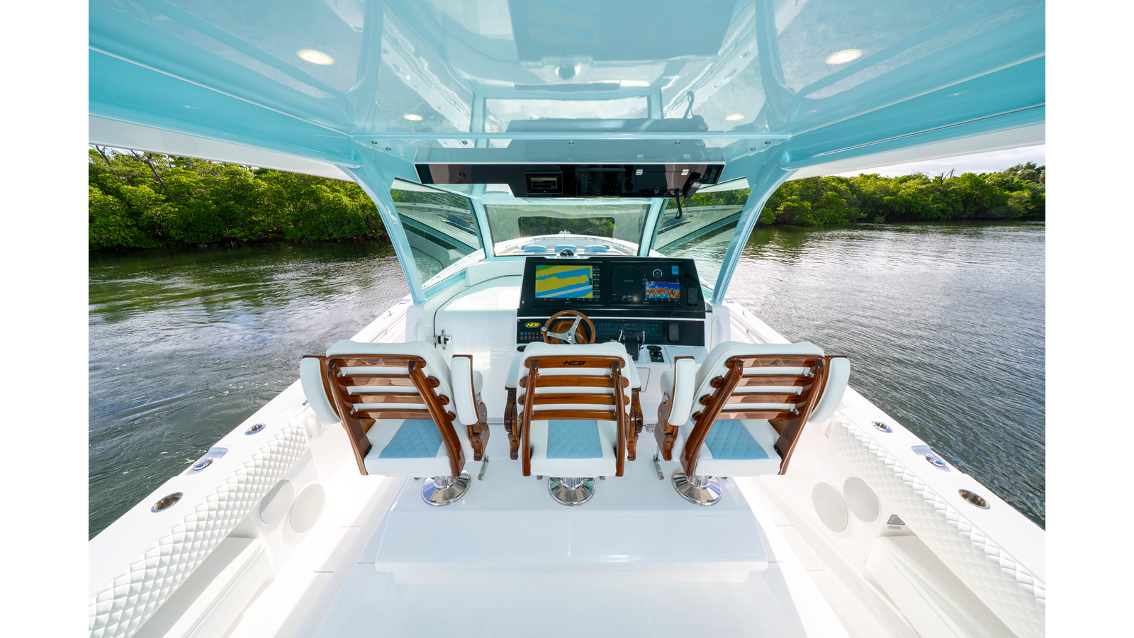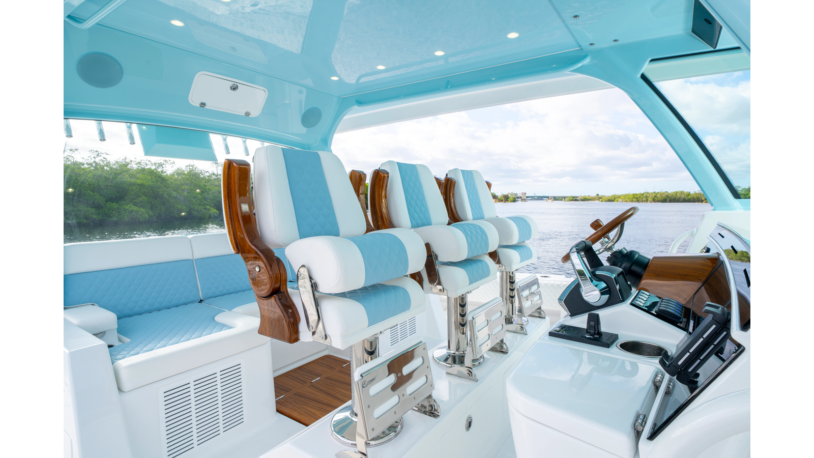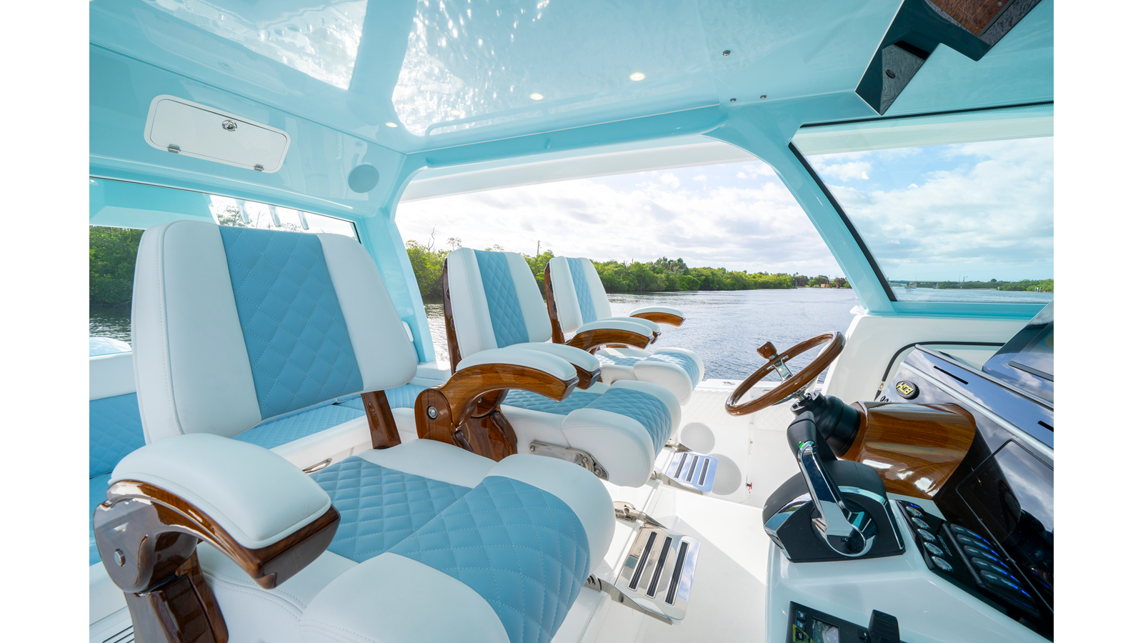 - Release Marine Triple Helm Seats with Teak Ladder Backs and Arm Rests