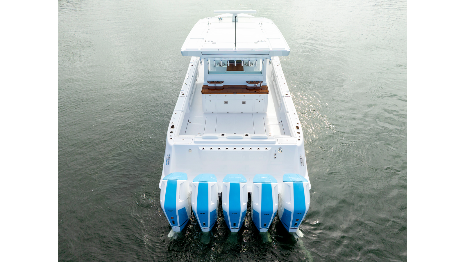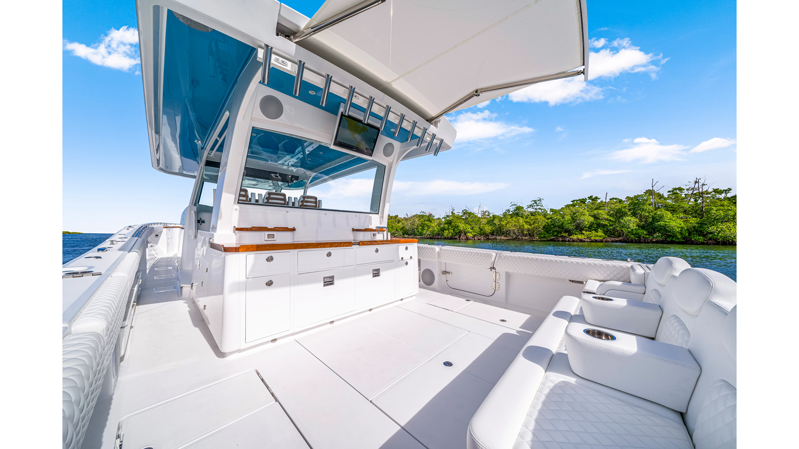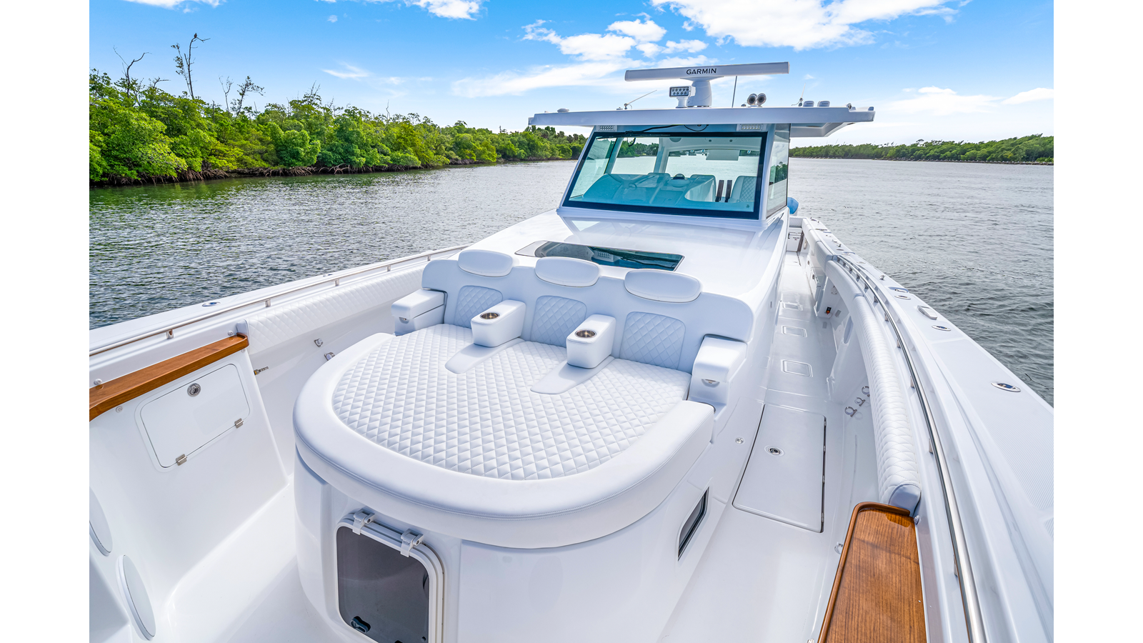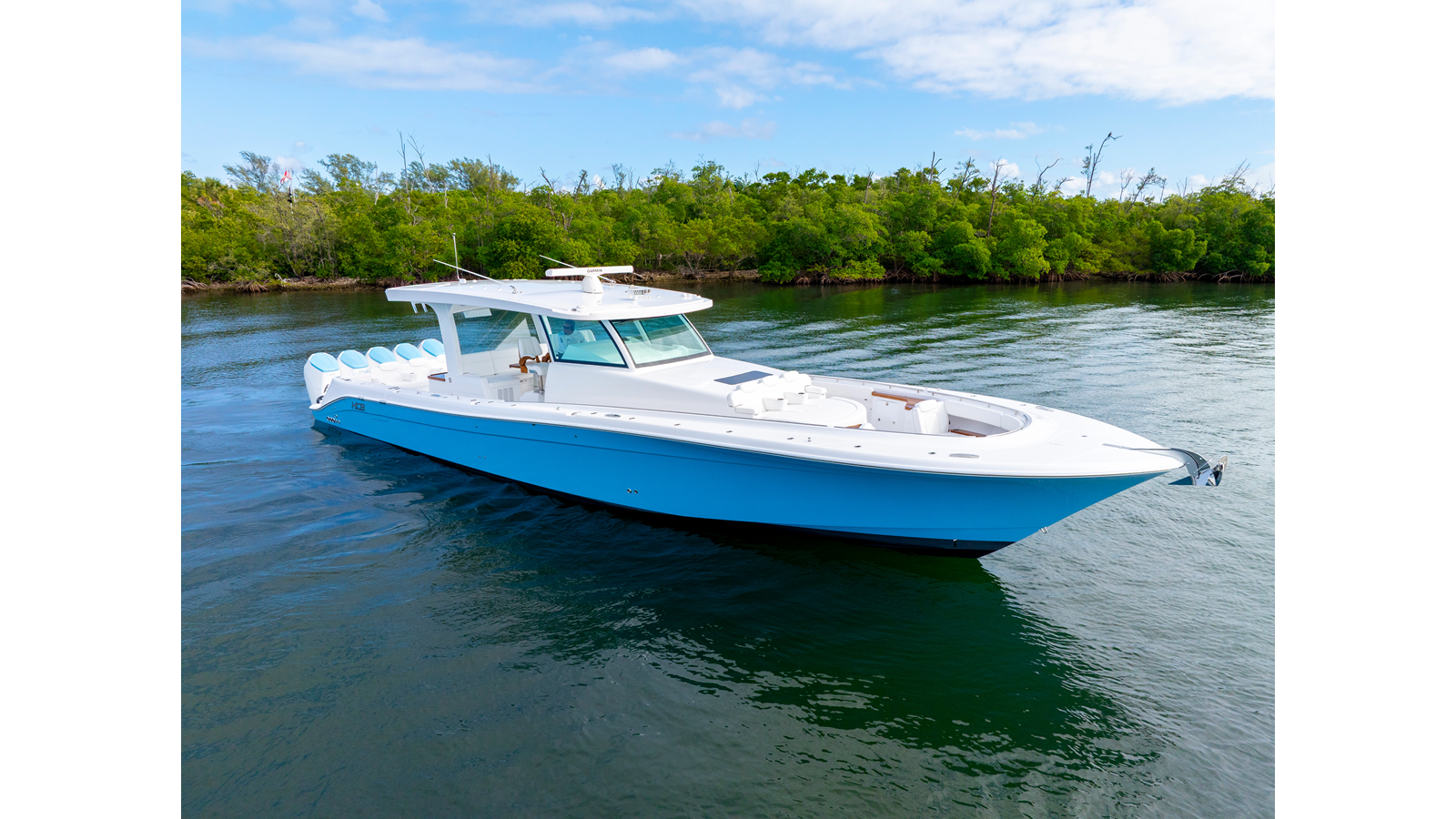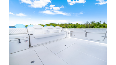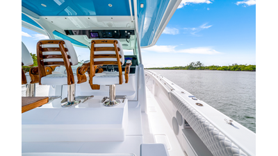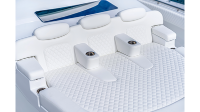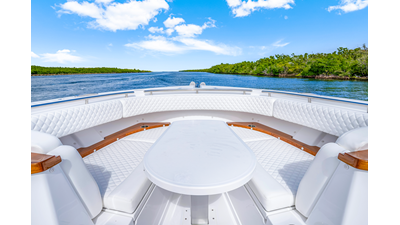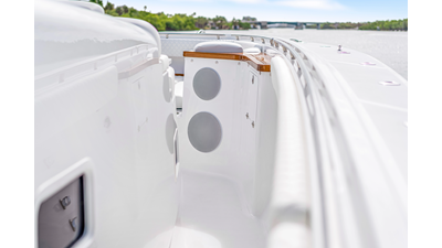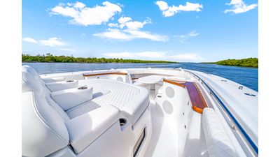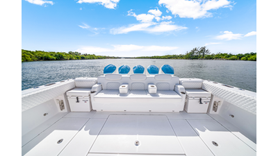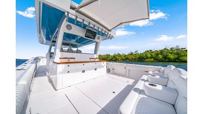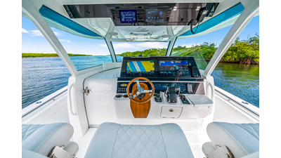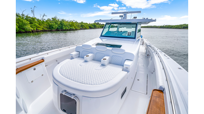 Notable Features: • Quint Mercury V12 600 HP • SeaKeeper 9 • Starlink Wi-Fi with Roku connection • Garmin 24" upgraded helm screens • Garmin aft-facing screen, AIS system, 6' radar, XM Weather • Helm A/C plus secondary cockpit A/C unit • Tempered glass aft wind blocker • Electronic aft sunshade recessed into hardtop • JL Audio Luxe flush-mount speakers • Black steering wheel with power knob • Bentley or diamond pattern premium stitching • Gem Lux outriggers and rod holder upgrade • Electric reel outlets • Downrigger weight bucket • Transom seat with dual 25-gal baitwell and molded armrests • Port and starboard 38qt transom cooler seats • Fisher Panda 15KW generator with water-separated exhaust and 55-gal diesel tank • Underwater lighting • Rainfall shower • Stainless steel rub rail accent • Loaded with additional upgrades