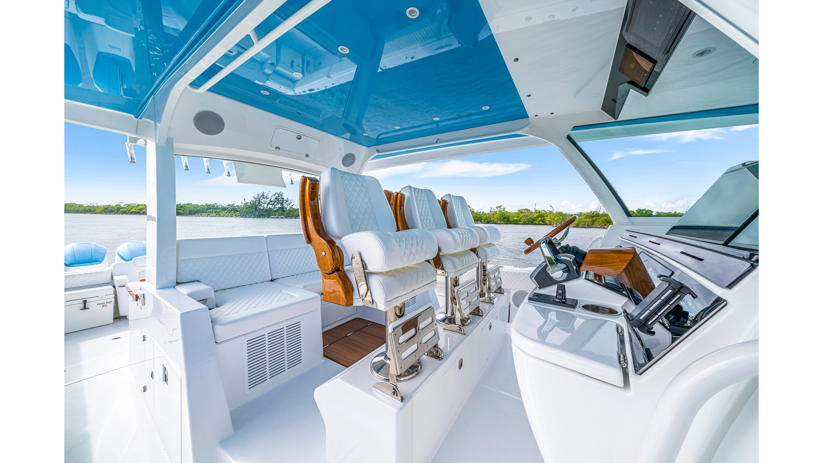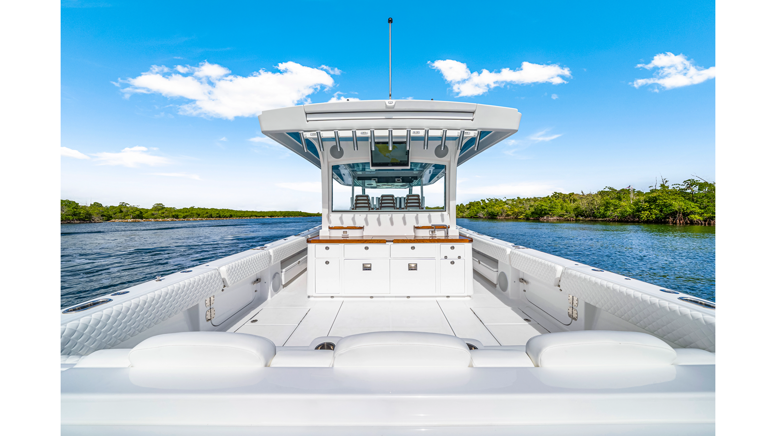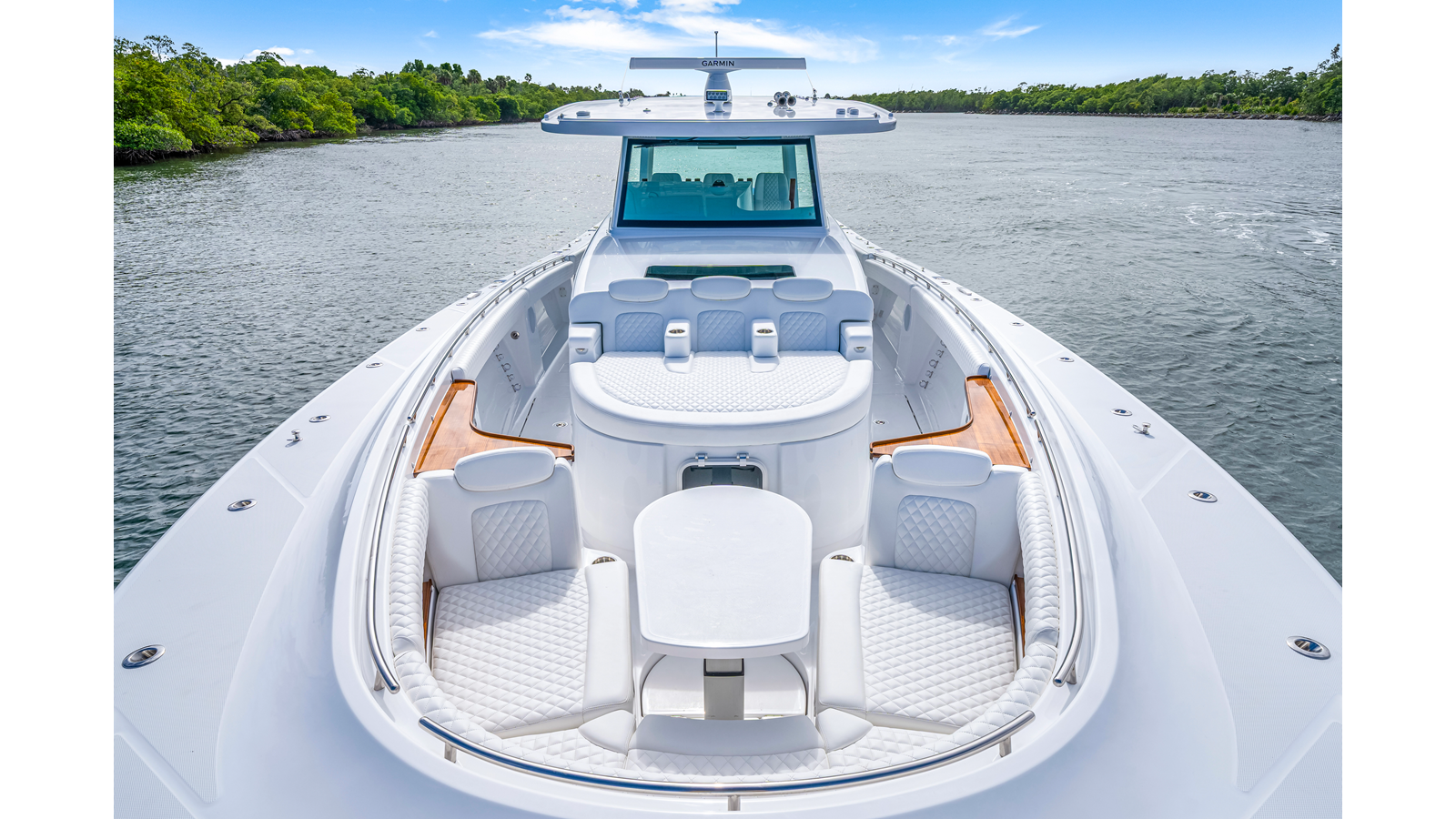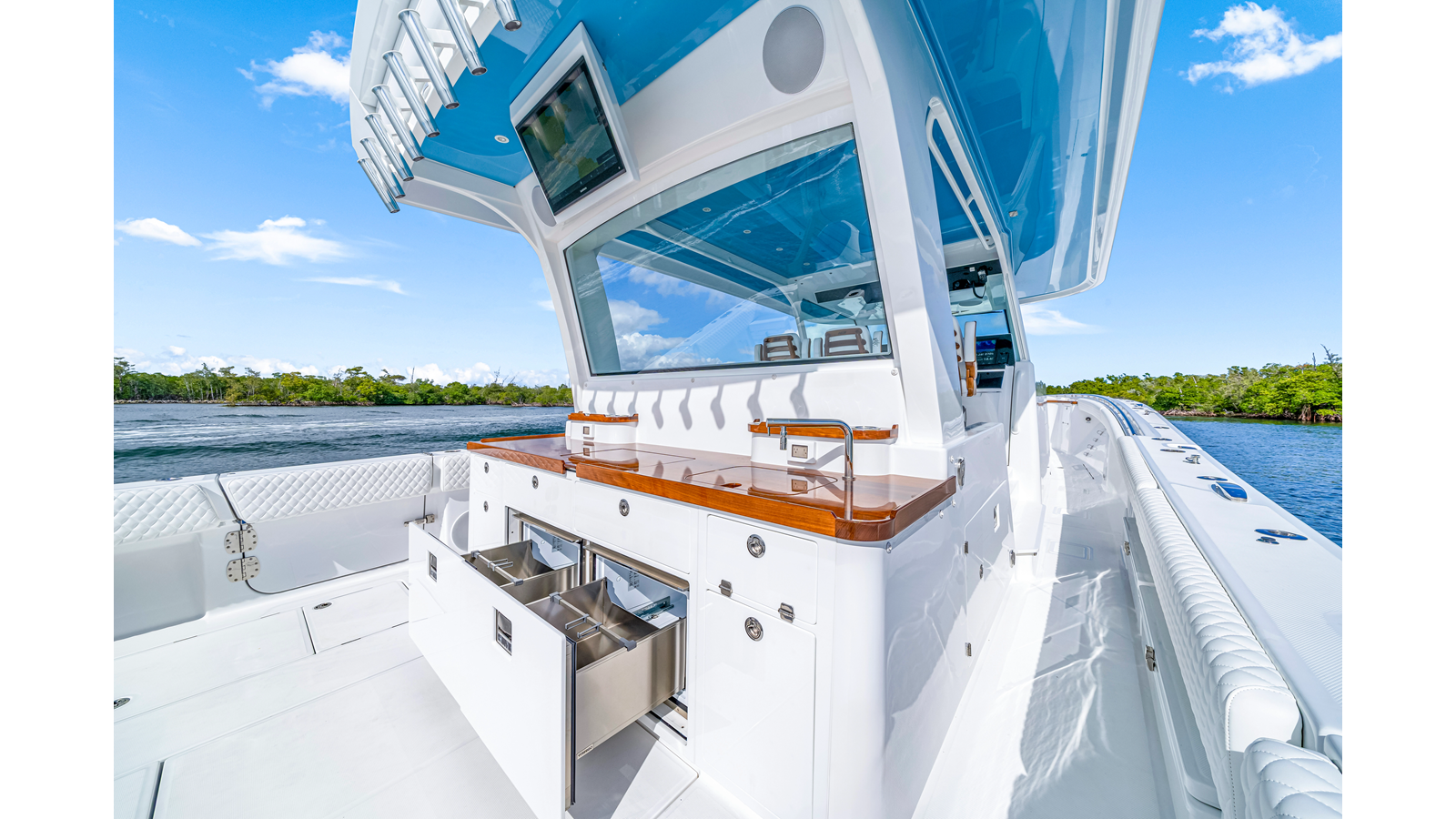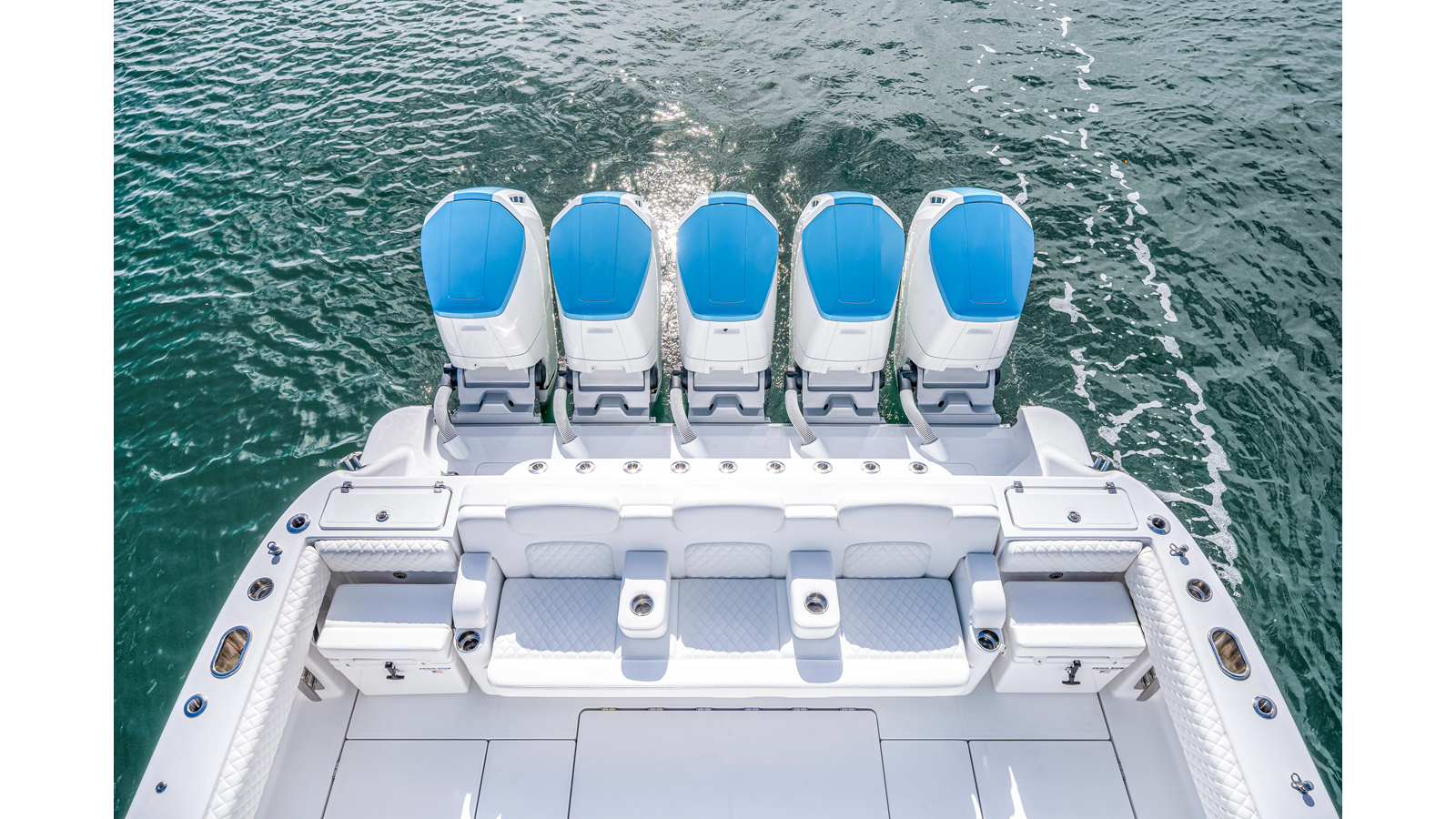 Notable Features: • Quint Mercury V12 600 HP • SeaKeeper 9 • Starlink Wi-Fi with Roku connection • Garmin 24" upgraded helm screens • Garmin aft-facing screen, AIS system, 6' radar, XM Weather • Helm A/C plus secondary cockpit A/C unit • Tempered glass aft wind blocker • Electronic aft sunshade recessed into hardtop • JL Audio Luxe flush-mount speakers • Black steering wheel with power knob • Bentley or diamond pattern premium stitching • Gem Lux outriggers and rod holder upgrade • Electric reel outlets • Downrigger weight bucket • Transom seat with dual 25-gal baitwell and molded armrests • Port and starboard 38qt transom cooler seats • Fisher Panda 15KW generator with water-separated exhaust and 55-gal diesel tank • Underwater lighting • Rainfall shower • Stainless steel rub rail accent • Loaded with additional upgrades