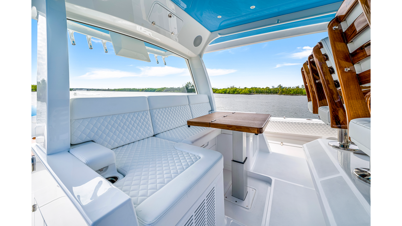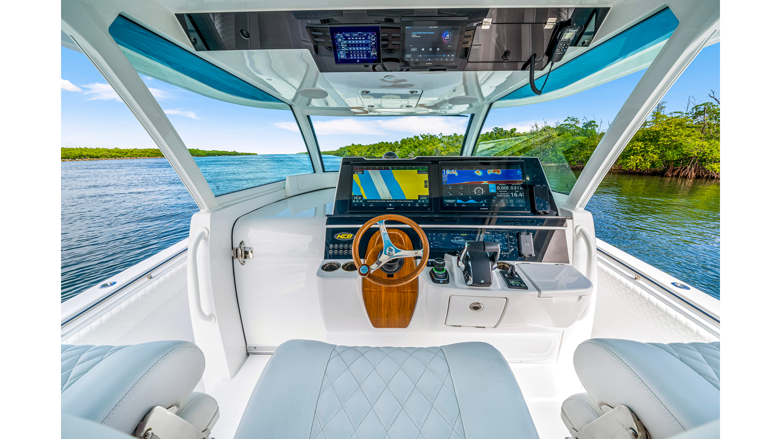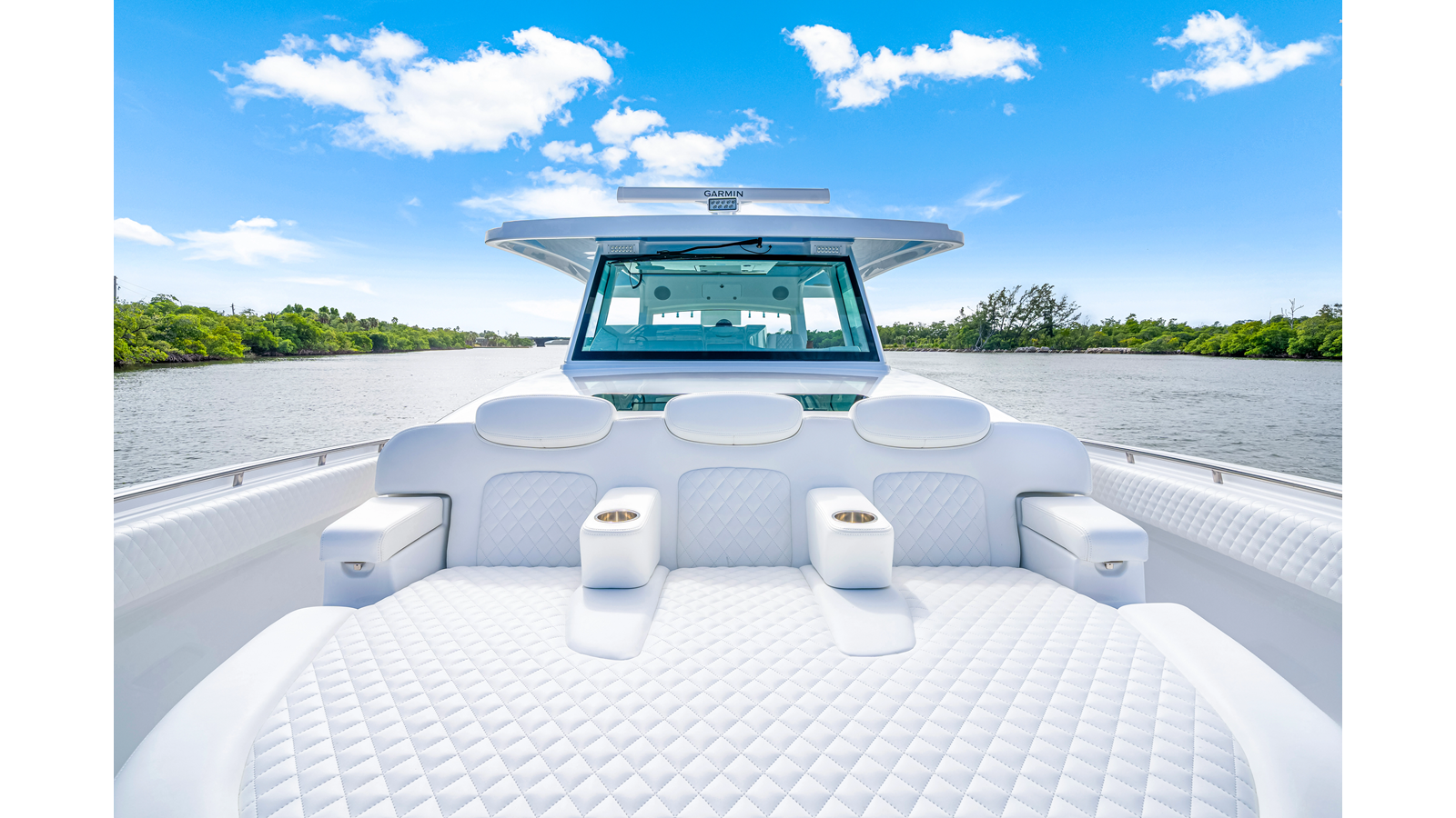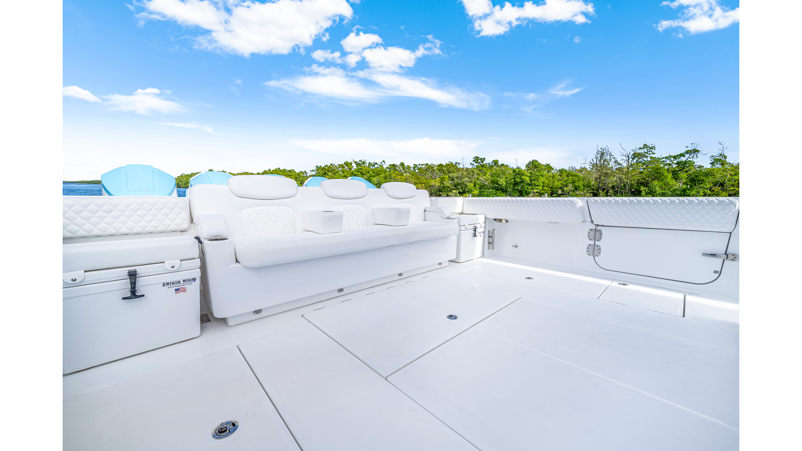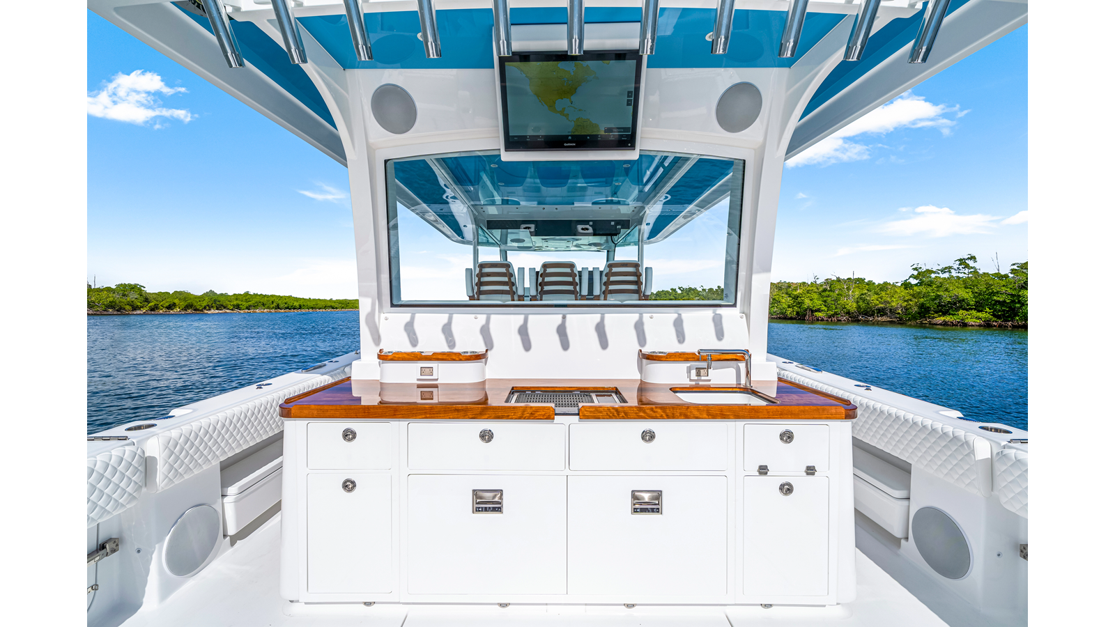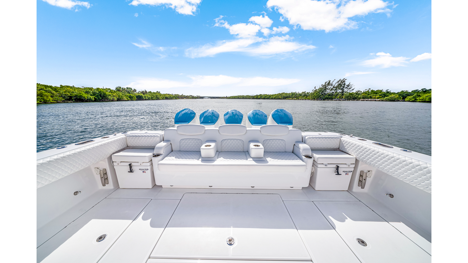 Notable Features: • Quint Mercury V12 600 HP • SeaKeeper 9 • Starlink Wi-Fi with Roku connection • Garmin 24" upgraded helm screens • Garmin aft-facing screen, AIS system, 6' radar, XM Weather • Helm A/C plus secondary cockpit A/C unit • Tempered glass aft wind blocker • Electronic aft sunshade recessed into hardtop • JL Audio Luxe flush-mount speakers • Black steering wheel with power knob • Bentley or diamond pattern premium stitching • Gem Lux outriggers and rod holder upgrade • Electric reel outlets • Downrigger weight bucket • Transom seat with dual 25-gal baitwell and molded armrests • Port and starboard 38qt transom cooler seats • Fisher Panda 15KW generator with water-separated exhaust and 55-gal diesel tank • Underwater lighting • Rainfall shower • Stainless steel rub rail accent • Loaded with additional upgrades