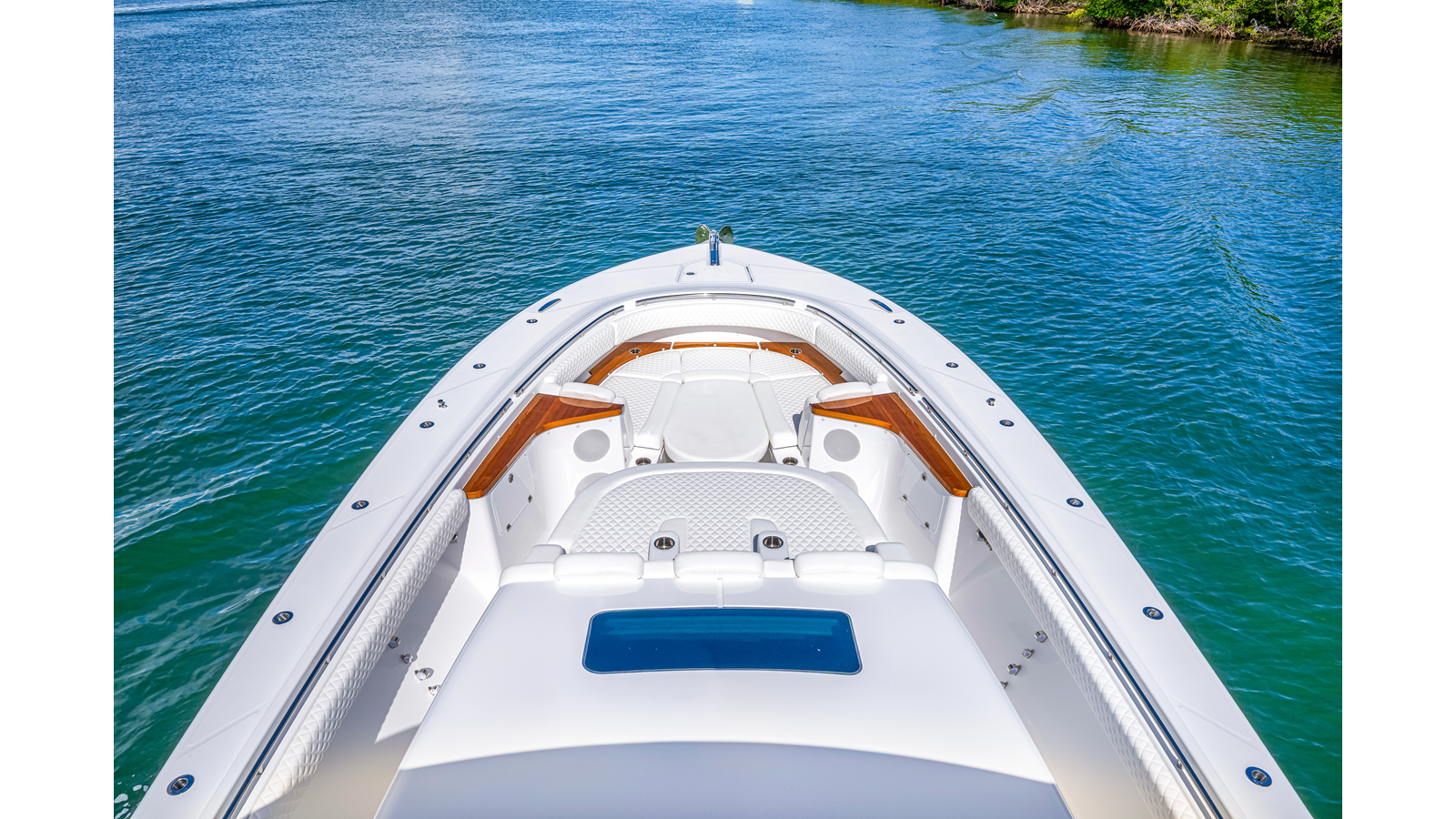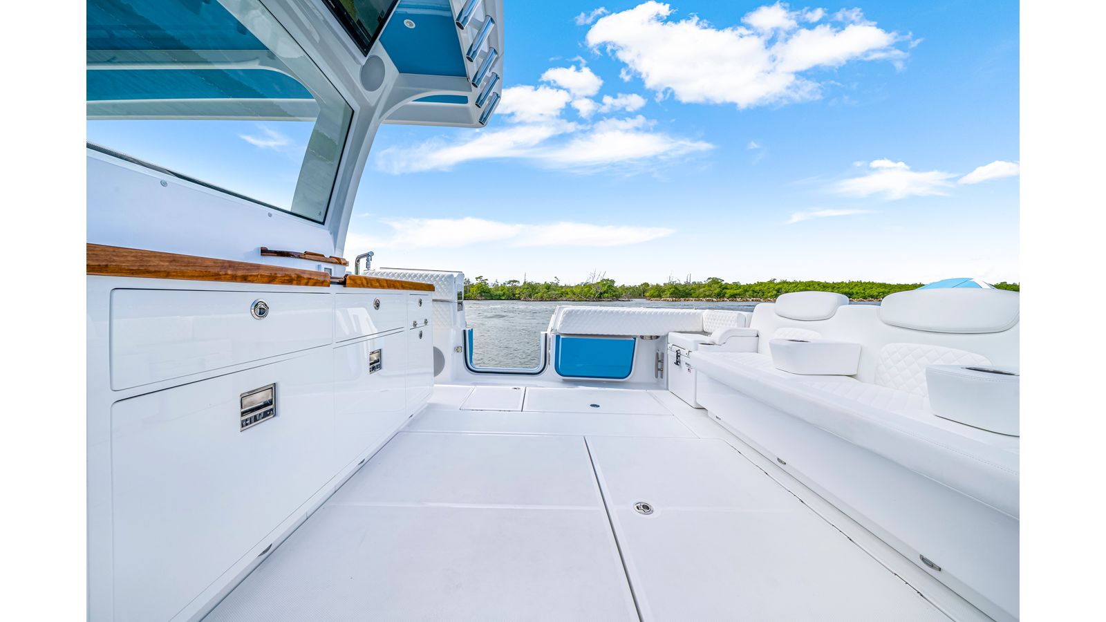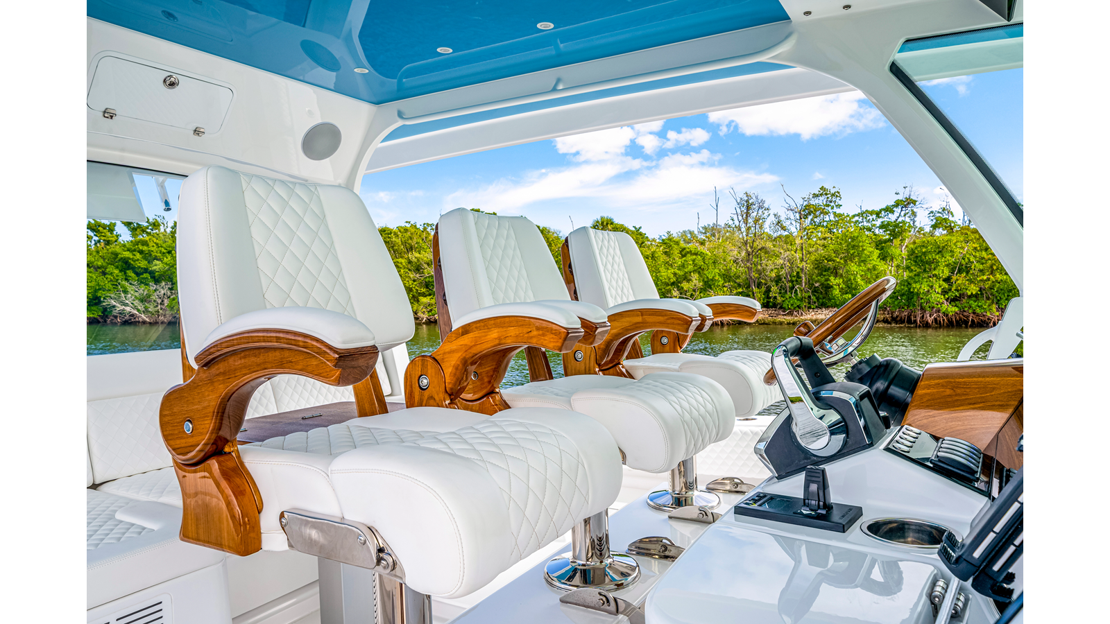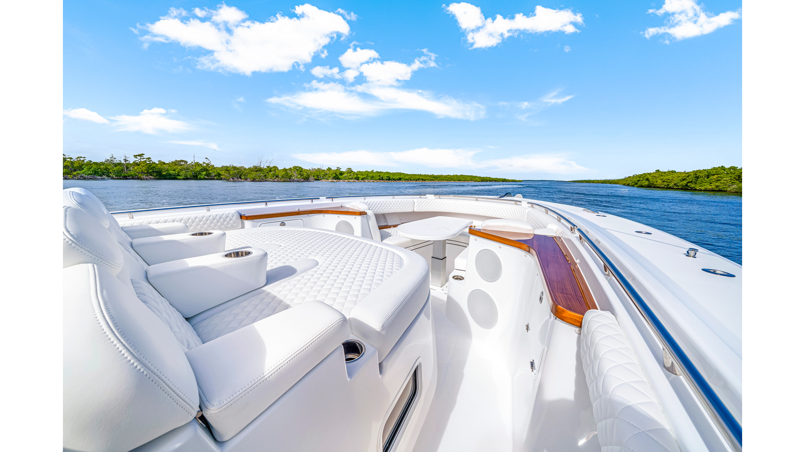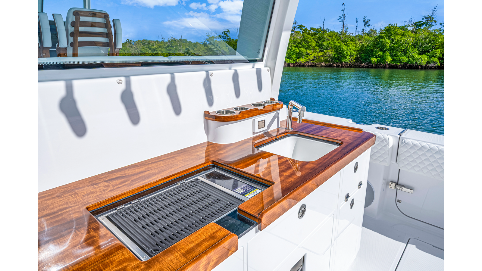 Notable Features: • Quint Mercury V12 600 HP • SeaKeeper 9 • Starlink Wi-Fi with Roku connection • Garmin 24" upgraded helm screens • Garmin aft-facing screen, AIS system, 6' radar, XM Weather • Helm A/C plus secondary cockpit A/C unit • Tempered glass aft wind blocker • Electronic aft sunshade recessed into hardtop • JL Audio Luxe flush-mount speakers • Black steering wheel with power knob • Bentley or diamond pattern premium stitching • Gem Lux outriggers and rod holder upgrade • Electric reel outlets • Downrigger weight bucket • Transom seat with dual 25-gal baitwell and molded armrests • Port and starboard 38qt transom cooler seats • Fisher Panda 15KW generator with water-separated exhaust and 55-gal diesel tank • Underwater lighting • Rainfall shower • Stainless steel rub rail accent • Loaded with additional upgrades