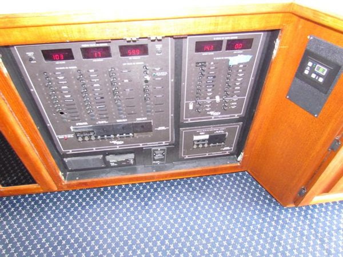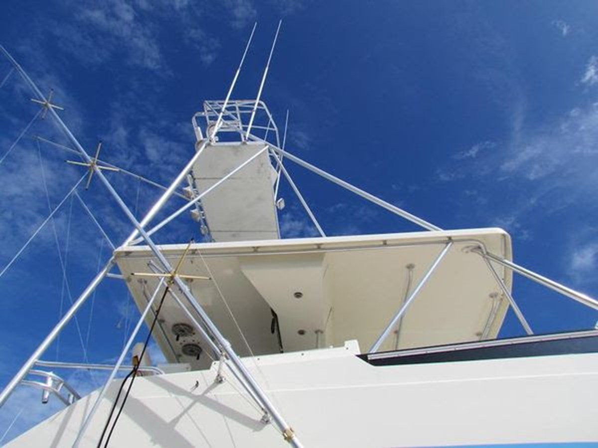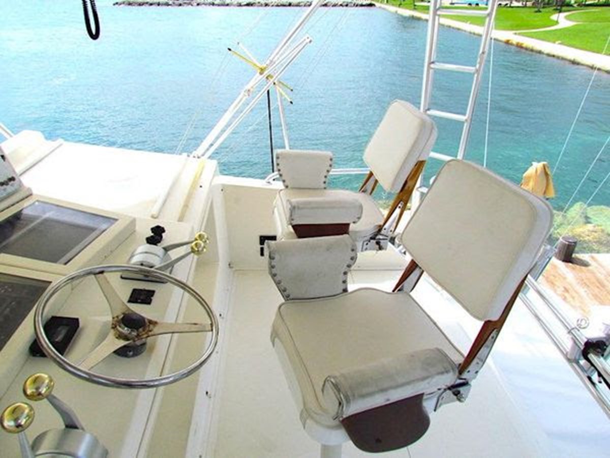 On the flybridge there are two large captains chairs at the helm, and a forward seating area that can accommodate 6 people. It has a fiberglass top that provided shade and protection from the weather. There is another helm station at the top of the tuna tower.