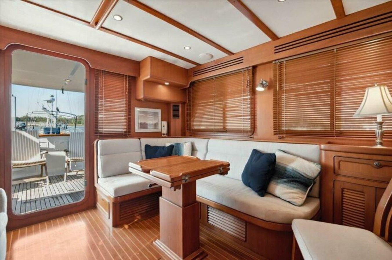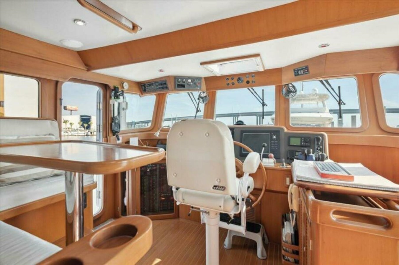 The pilothouse is forward of the galley/salon and aft of the foredeck. It provides excellent visibility from the helm and has exterior doors to port and starboard. There is an L-shaped settee with a teak table, a single pilot berth, and a helm seat.