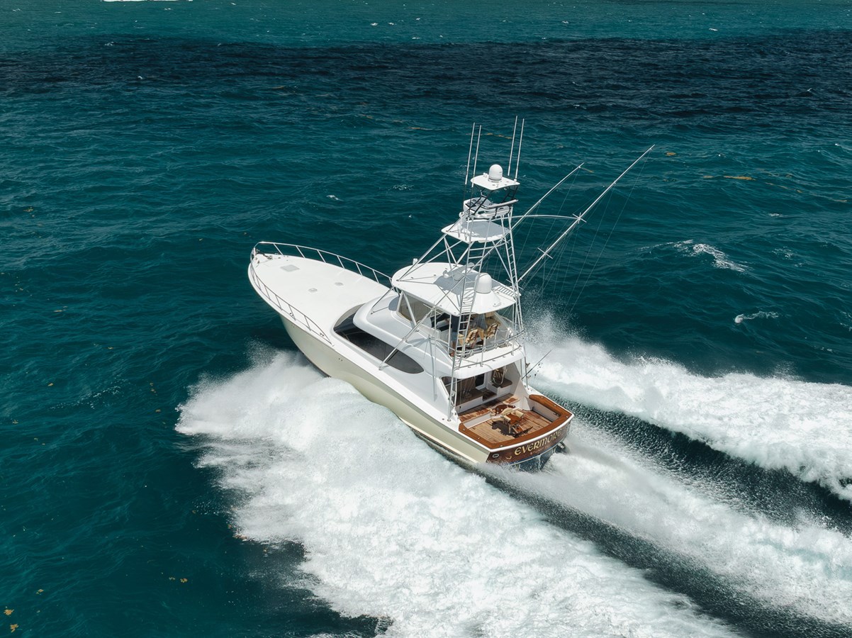 Evermore is a nicely equipped captain maintained Caterpillar powered Hatteras GT. Entering the spacious salon with adjoining galley the deep rich high gloss cherry veneers, & custom granite surfaces provide the quality feel that is Hatteras. The gorgeous interior is complemented with 3 spacious staterooms and three heads ideal for owners and friends to enjoy cruising , fishing or just time on board. The Hatteras quality and comfortable ride makes the experience even more enjoyable. The Caterpillar C-32-A provide a low cruise of 30 Kts burning 78 GPH with a reported draft of 4' 8"