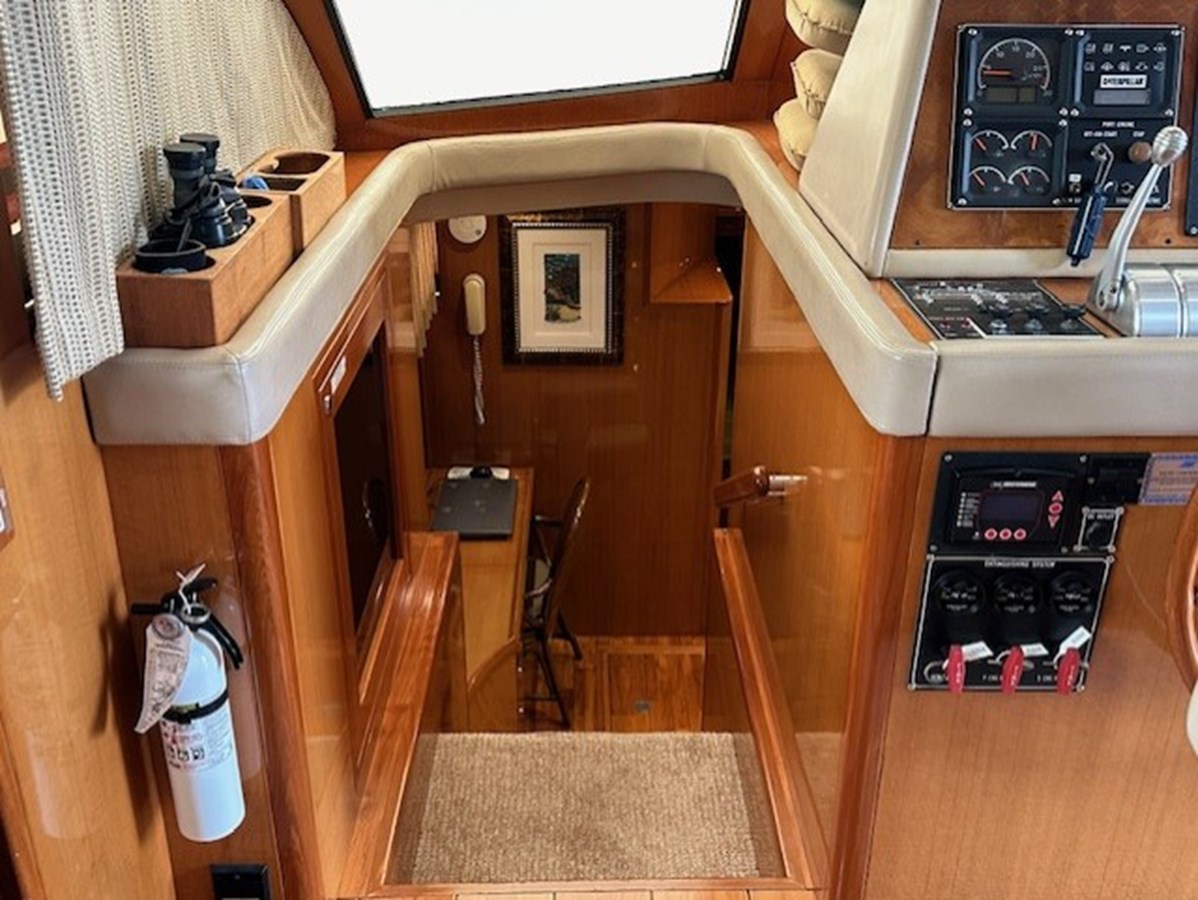 Entering from the starboard door brings you to the pilothouse with a full array of updated electronics and control panels. The interior is attractive varnished cherry with matching hardwood flooring throughout. The attractive interior was updated in 2022 and shows very well. Proceeding aft brings you to the spacious salon with leather sofa, table and two chairs. The entertainment center is on the forward bulkhead with additional refrigerator and freezer. The galley is up and located at the stern of the salon. This layout is very popular and you can imagine the views from this space. There is a dining settee with a teak folding table. The galley is well equipped with updated refrigerator/freezer, microwave, oven and a dishwasher. There is a large double SS sink forward and a small breakfast bar. The galley has tons of drawer and pantry storage. The aft door opens to a covered deck with a stainless steel grill, steps on the starboard side take you to the cockpit with transom door, swim platform and good lazarette storage. The flybridge is accessed from the pilothouse via stairs and has a helm seat with a settee to port and bench seating to starboard with a wet bar aft. The enclosure has been updated and a full electronics package at the helm. The afterdeck is spacious and has a folding bimini top. The davit and tender are stowed aft.