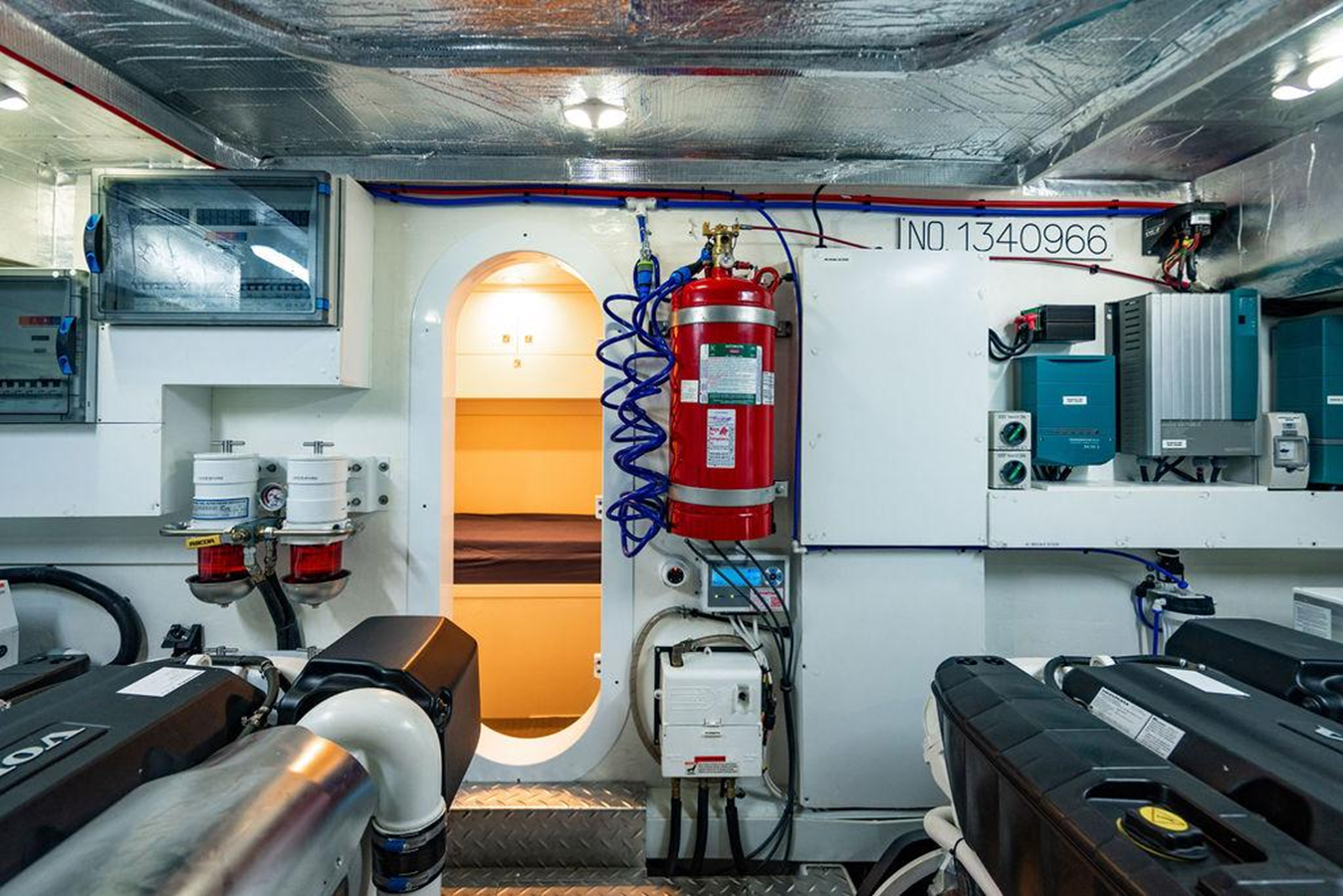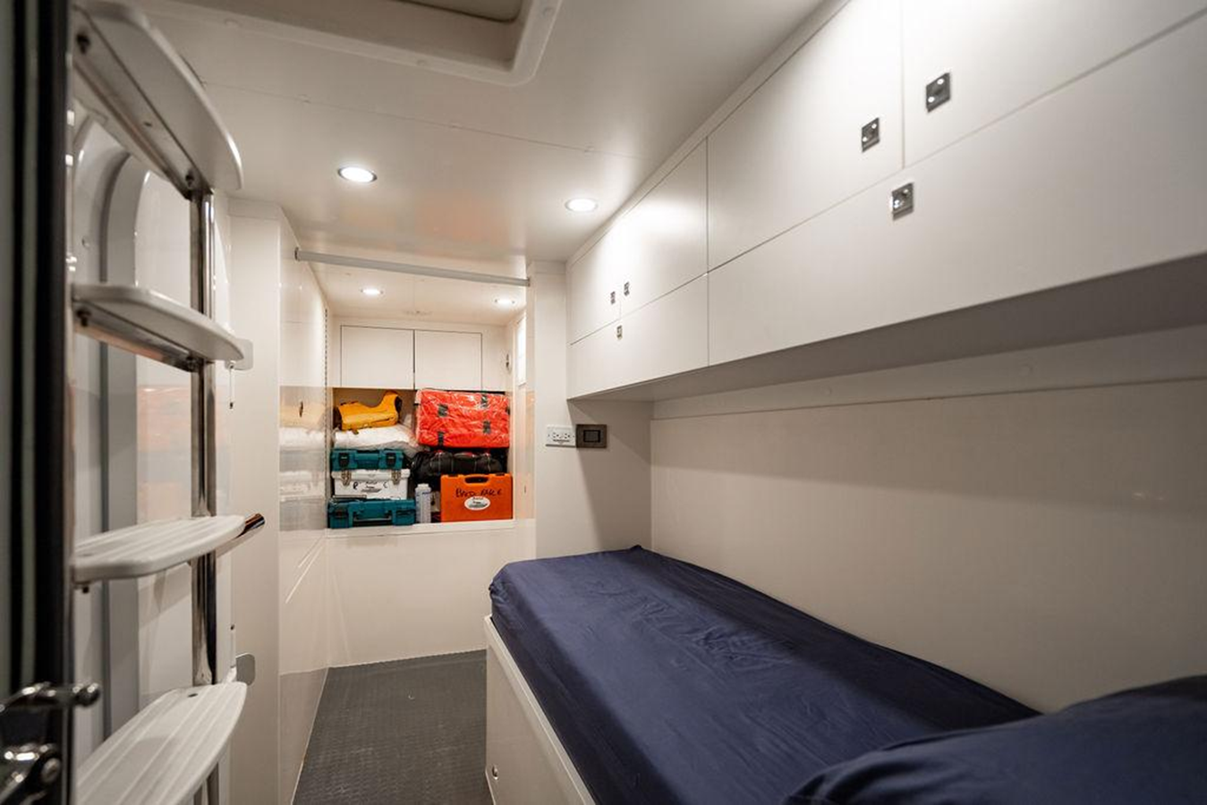 -Single berth -Access to master cabin robe through sound insulated door -Engine room access through watertight door -Ladder to allow access to cockpit -Lockers and workbench above fuel tank. -Access point to full shutoff valves -Rubber matting to floor and workbench -Storage room liner including GRP non skid floor Storage shelves to port