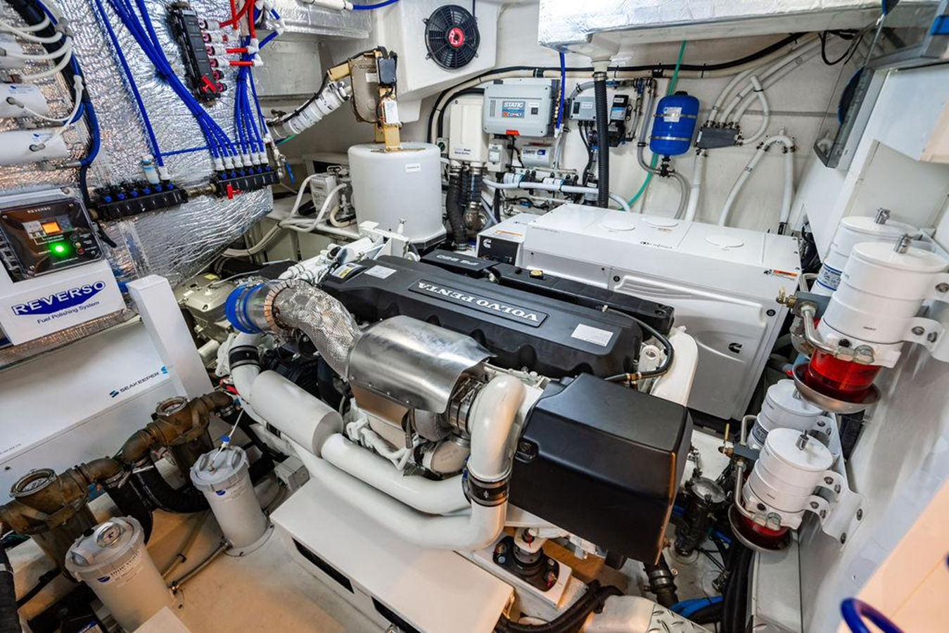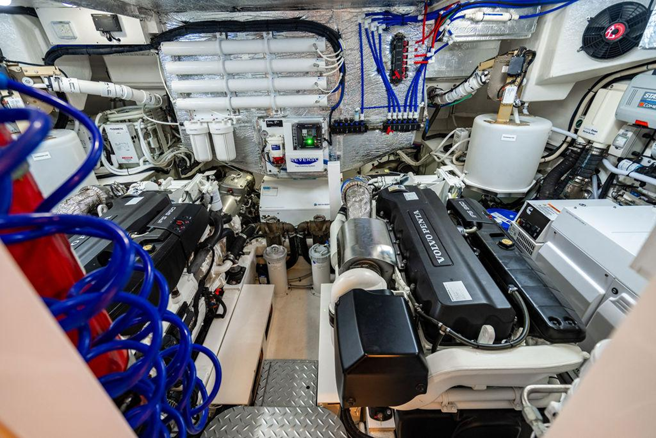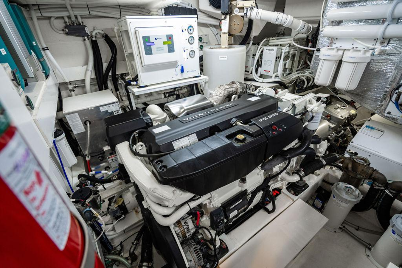 -ElectroSea Sea Strainer Systems -Reverso Fuel Polisher -BlueWater Clearmate Desalinater and Attached Purifier -Acoustic and thermal insulation in engine room -Air conditioning condenser units 36,000 + 16,000 + 10,000 BTU -Bilge pumps, auto and manual override x 4, with 2 x emergency high water pumps -Cockpit joystick mounted to portside and starboard in folding cabinet -Engine air intakes with mist eliminators -Engine exhaust integral with pod drive system -Engine mounts-anti vibration -Engine room lighting AC and DC -Fire suppression system for engine room with automatic & manual controls -Fresh water heater (AC) -Fresh water pressure pump DC powered -Fresh water pressure pump, secondary backup pump (switched independently) -Fresh water system with the dual water tanks, total capacity 211 US gallons -Fresh water tap and hose set in engine room -Fuel filters/water separator for engines and generator, DUAL to main engines -Fuel lines all swaged -Fuel shut-off valves -Fuel tank, GRP coated in fire resin, 3300 liters (872 US gallons) -Generator Fiberglass aqualift muffler with water separator -High pressure washdown plumbed to outlets at bow and cockpit (supplied with 1x10 meter (32'8") Hose and spray wand) -Holding tank capacity 132 US gallons -Maneuvering at low speed via Volvo IPS joystick docking control -Oil change system to main engines and generator -Props-IPS twin forward facing, 3 blade front and 4 blade rear nibral, counter rotating props -Sanitation system with control for overboard pump out and deck fitting for dockside pump out (tank monitoring system with repeat in master) -Steering-IPS electric, progressive rate steering -Through hull fittings on or below the water line fitted with ball valves, all hoses double clamped -Volvo Engine monitoring display -Volvo Trim Tabs auto trim system -Volvo-ACP (Active Corrosion Protection) system -Volvo-Autopilot -Volvo-DPS (Dynamic Positioning System) -Volvo-line cutters fitted to drives -Volvo-low speed function