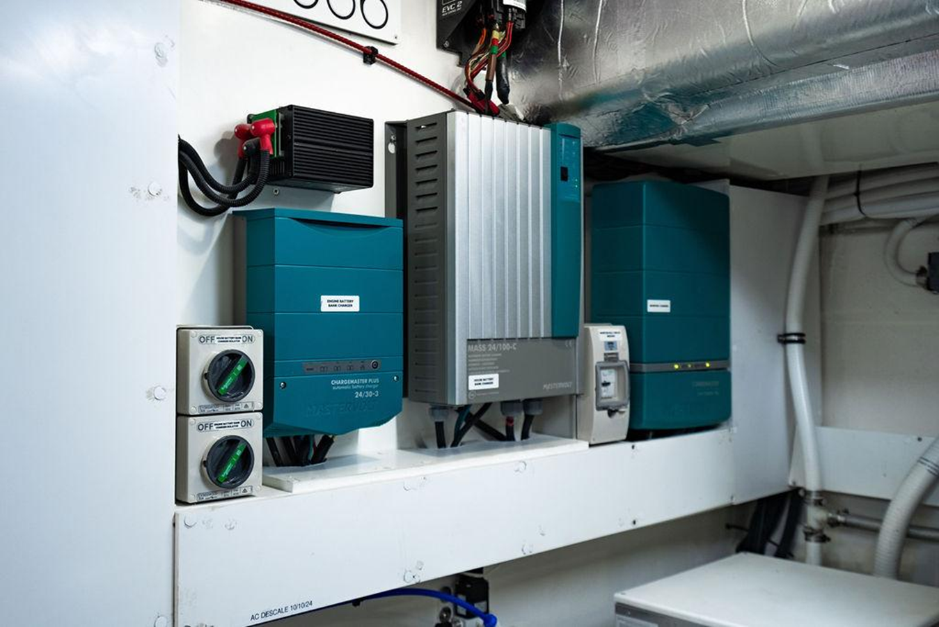 The house power is 24-volt, which allows for simpler charging, lower current draw and smaller cables (further reduced weight) than equivalent 12-volt systems. Mastervolt AC-DC inverters provide power to the icemaker, entertainment systems and all outlets onboard, ensuring watching television while relaxing quietly at anchor is whisper-quiet.