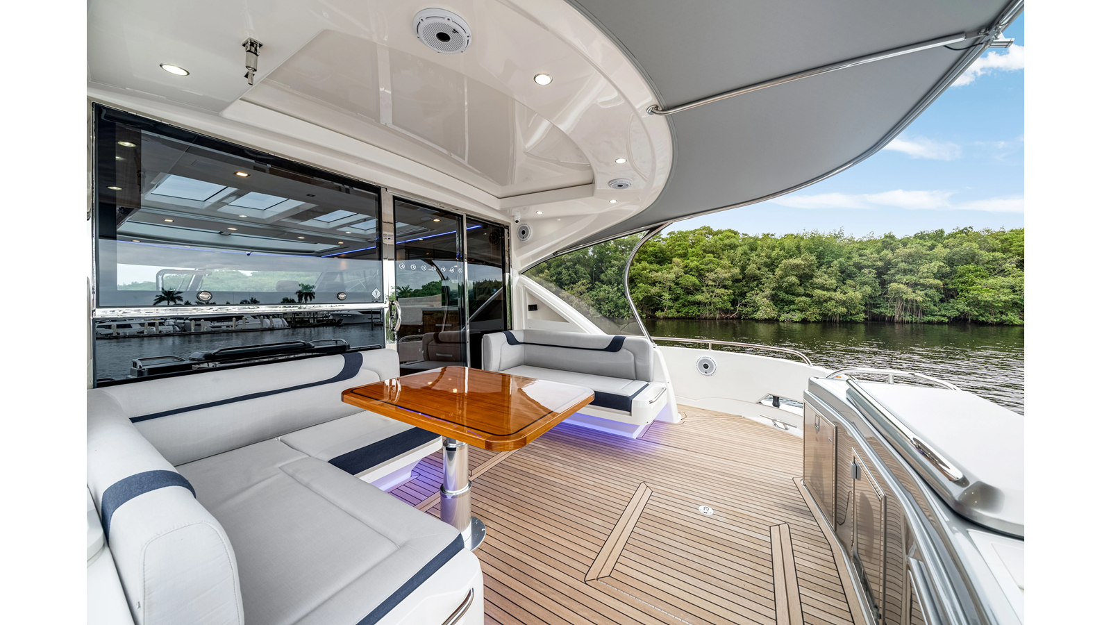 - Upholstery upgrade to cockpit lounge and foredeck sun pad - Sunbrella