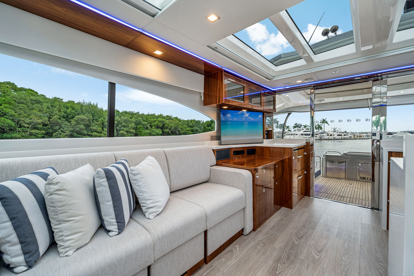 Introducing the Platinum Edition Riviera 6000 Sport Yacht! Featuring a long list of cosmetic and equipment upgrades, this is a fresh new take on a proven world-beater. We have this new, custom-built 6000 Sport Yacht. We spec'd her with the preferred lower lounge/three cabin/three head layout, high gloss walnut interior joinerwork, and a very long list of factory and custom options we would love to discuss with you.