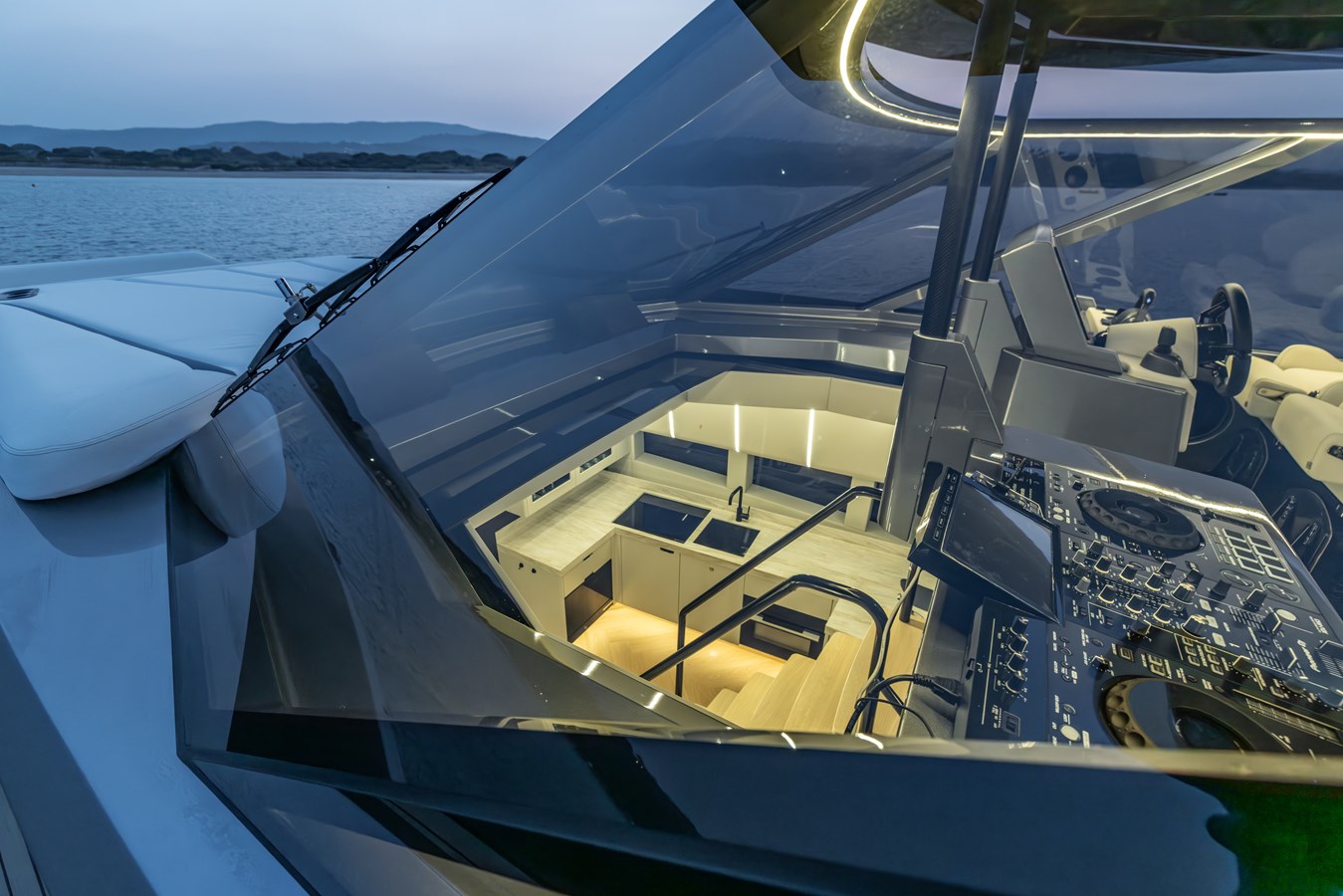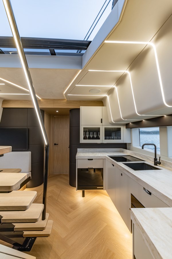 Voluminous Interior: Despite its sporty silhouette, the cabin offers a surprising 2.4 meters (8 ft) of headroom , accommodating 8 guests for day trips and providing overnight luxury in two spacious cabins.