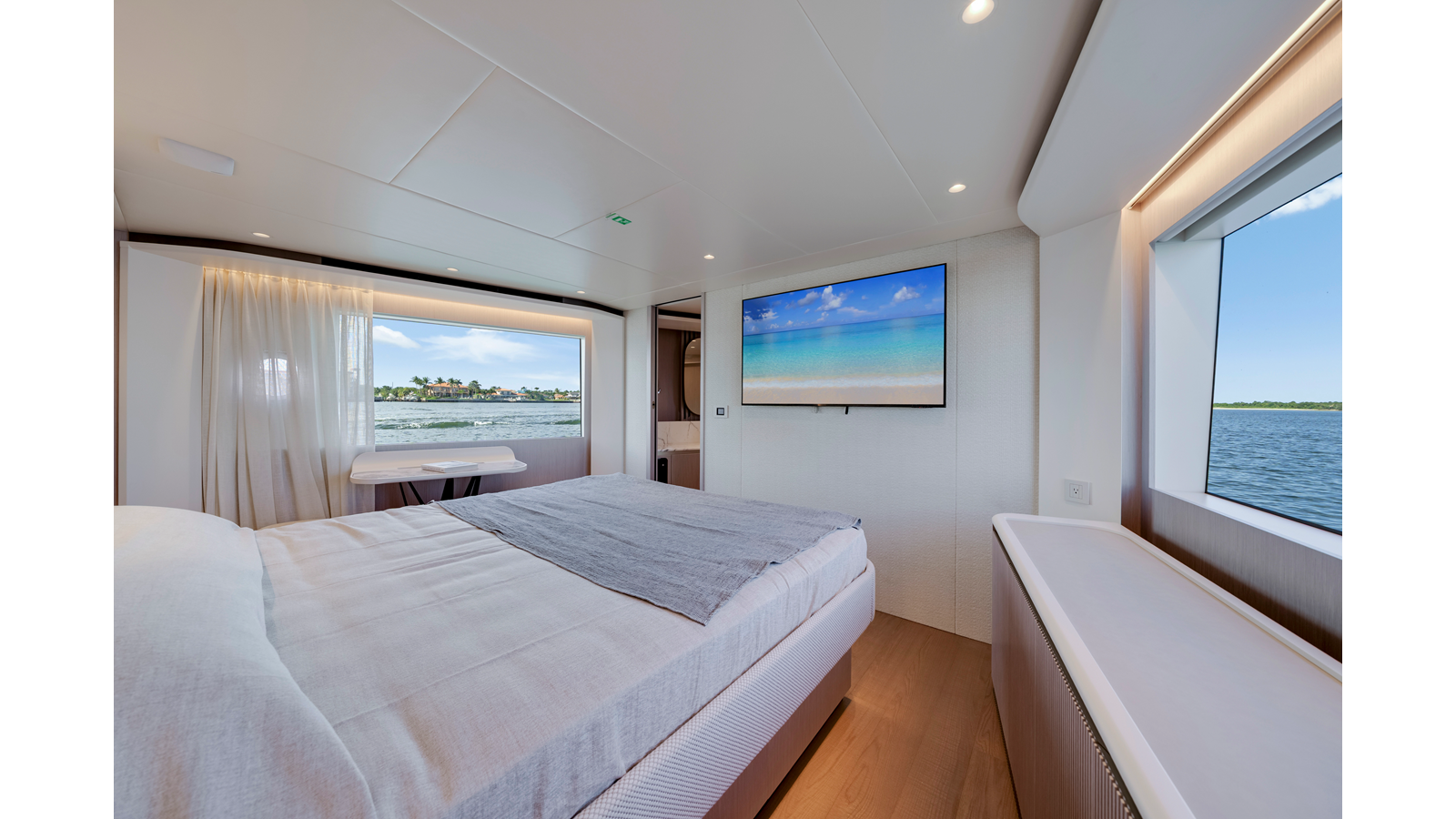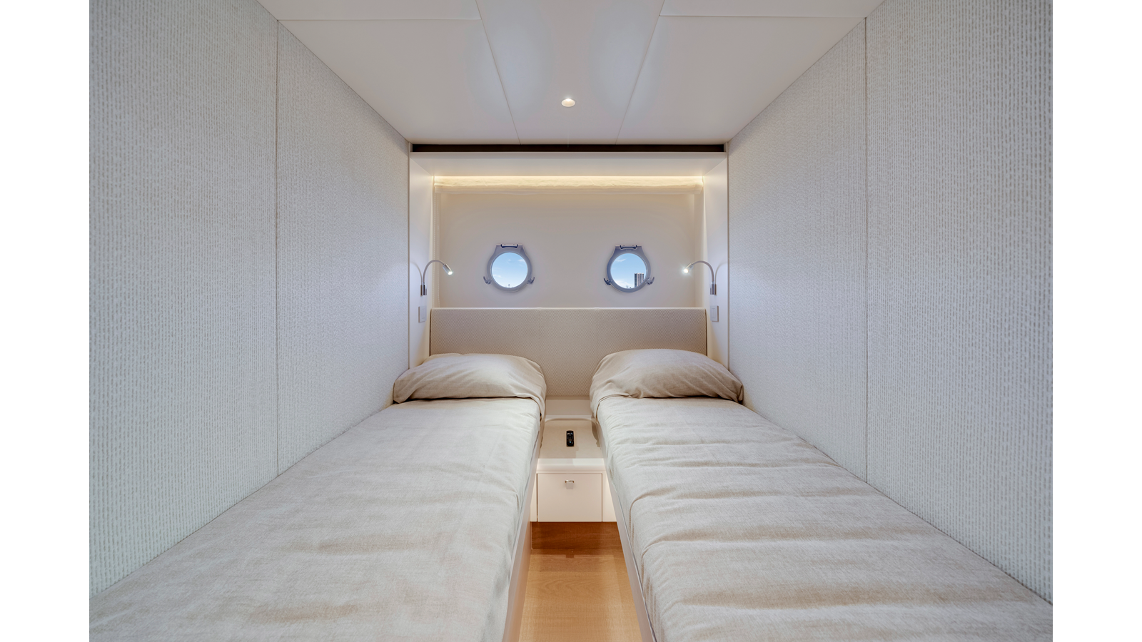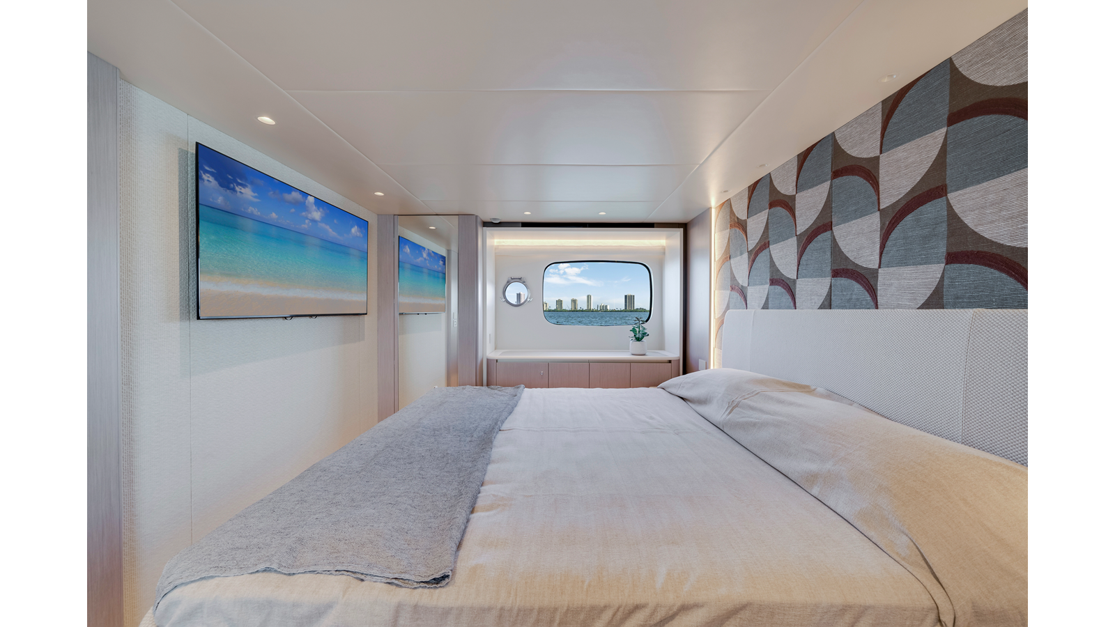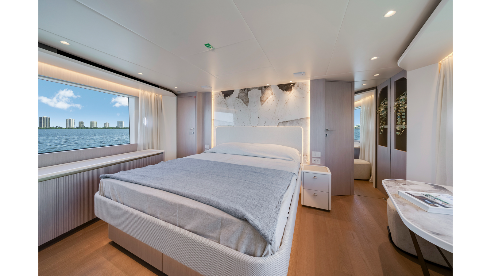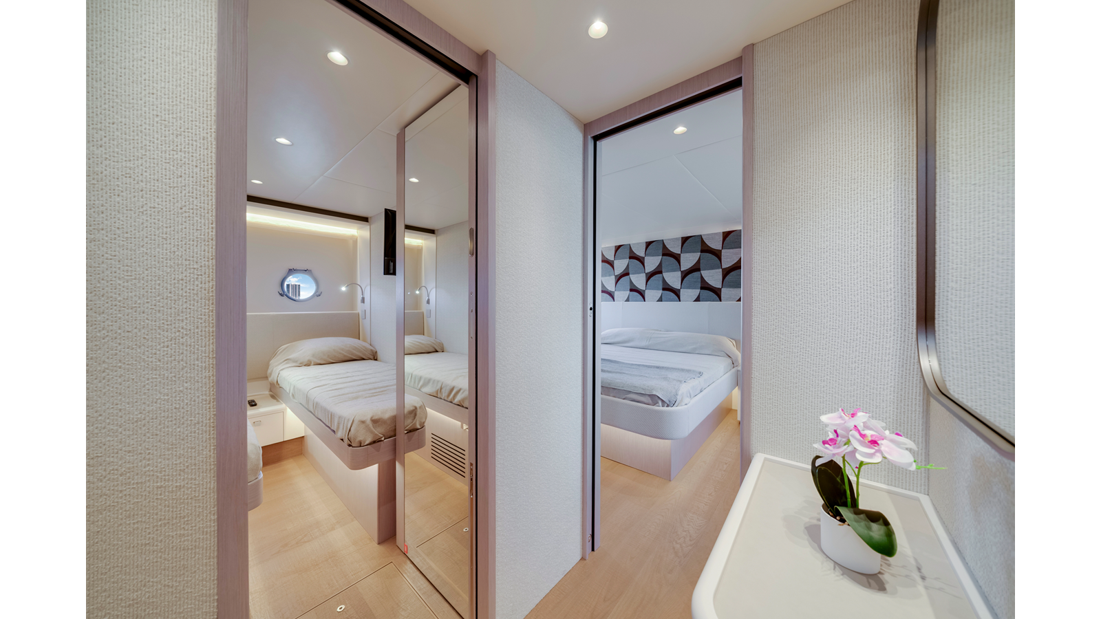 - Luxury Pack: salon dining table with ceramic surface, wall behind the headboard in bow master cabin in marble-effect ceramic and wall behind the headboard in VIP cabin with geometric pattern fabric