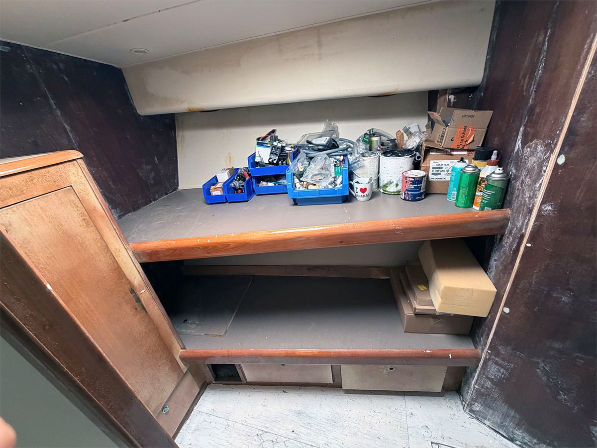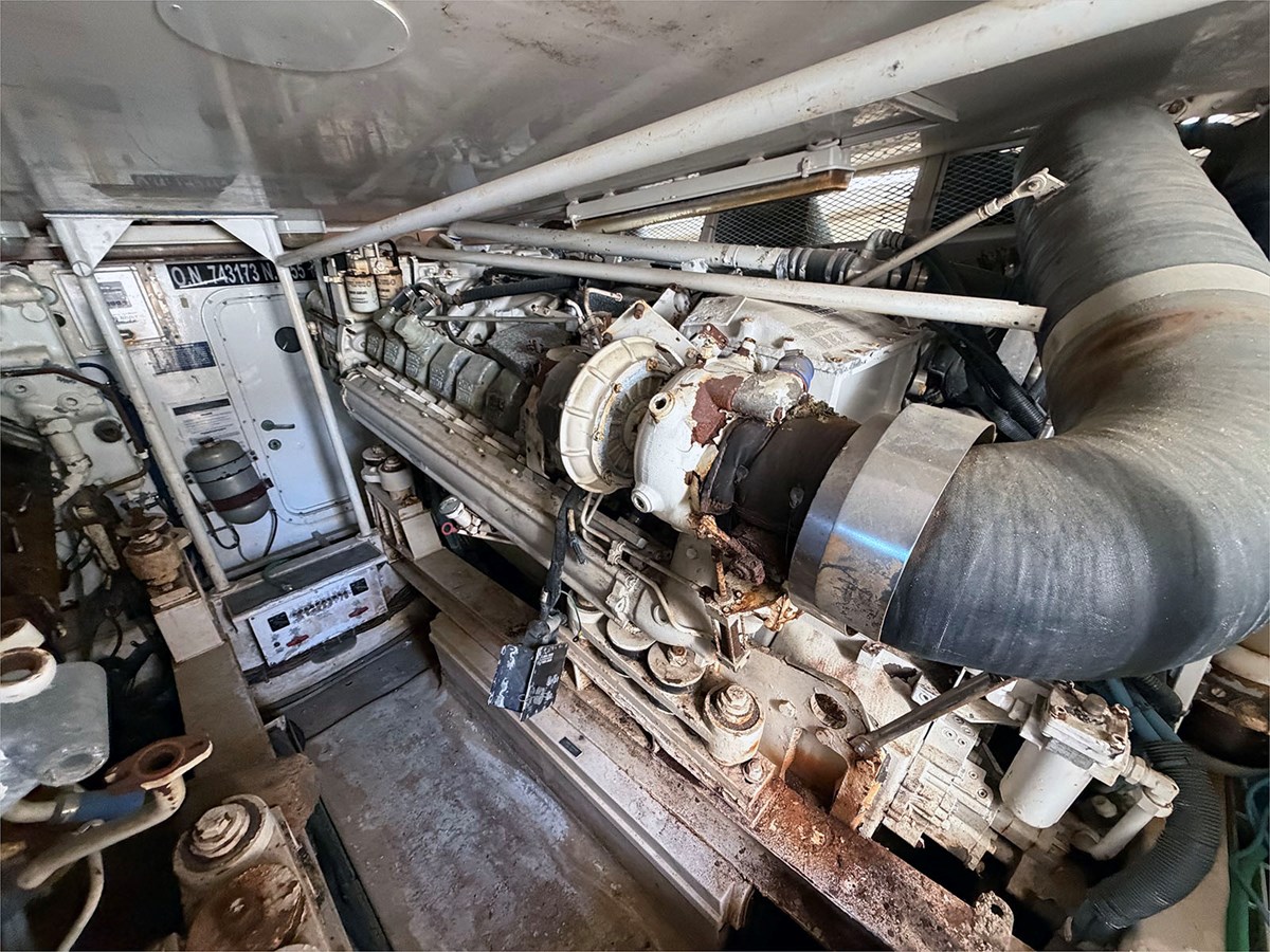 The yacht is currently land-stored and is being offered as a project vessel. It was originally equipped with twin MTU diesel engines; both engines are believed to be seized, and one has been partially disassembled with associated components included. As such, the engines will require either a complete rebuild or full replacement.