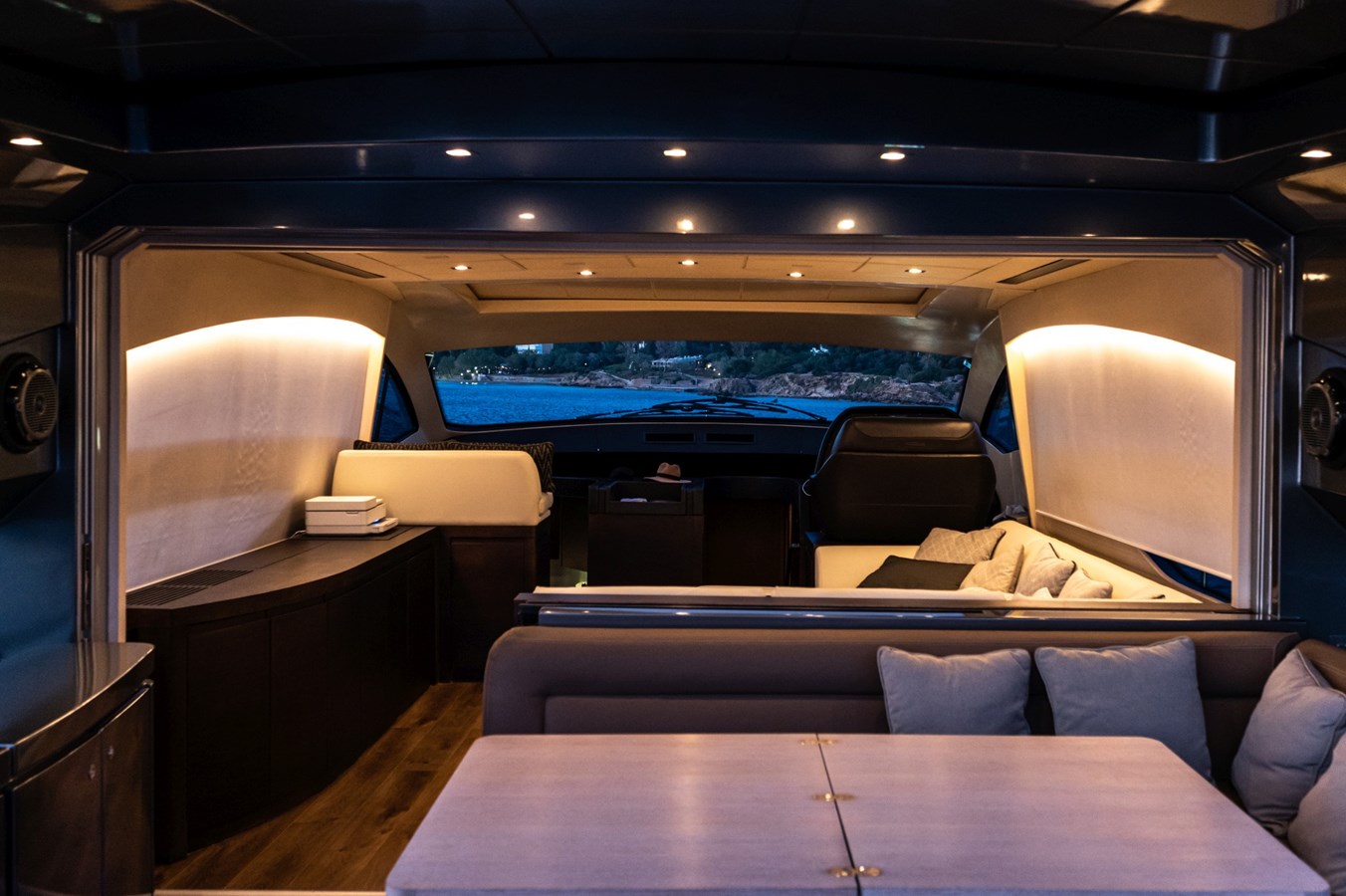 curve serves a purpose, whether channeling air for performance or creating visual harmony between hull and superstructure. The signature Pershing silver finish highlights its sporting DNA, while large side windows flood the interior with natural light. A hallmark of this model is the seamless connection between interior and exterior spaces: the glass aft bulkhead slides down completely, merging the salon and cockpit into one expansive entertainment area.