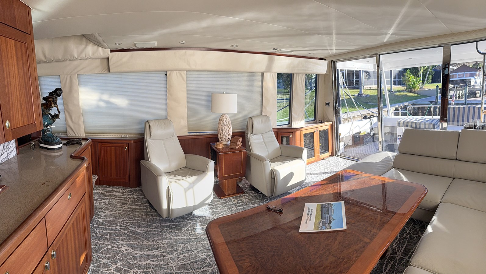 Boarding the vessel from the Aft Deck you enter the Salon from stainless steel framed sliding glass doors.