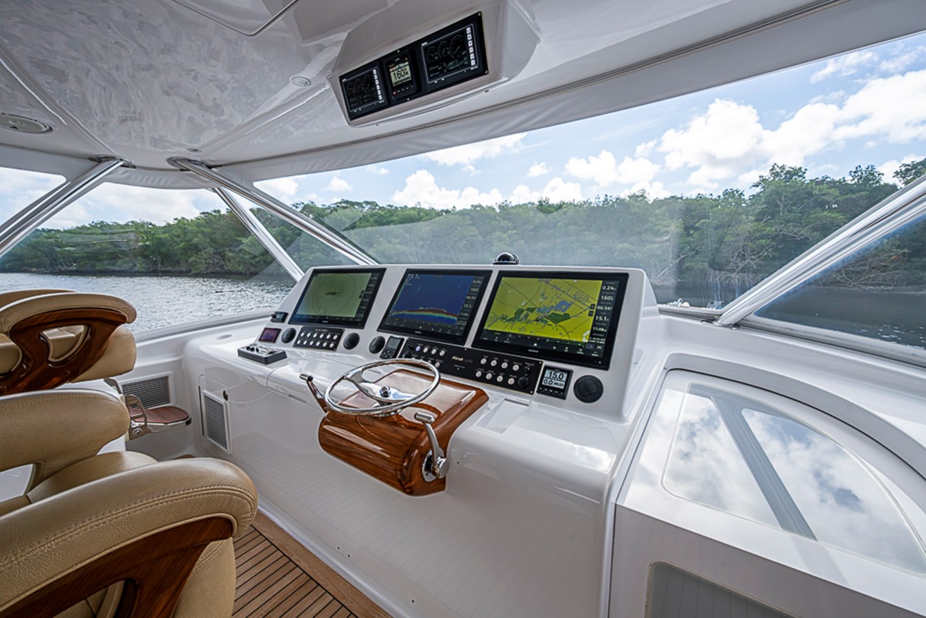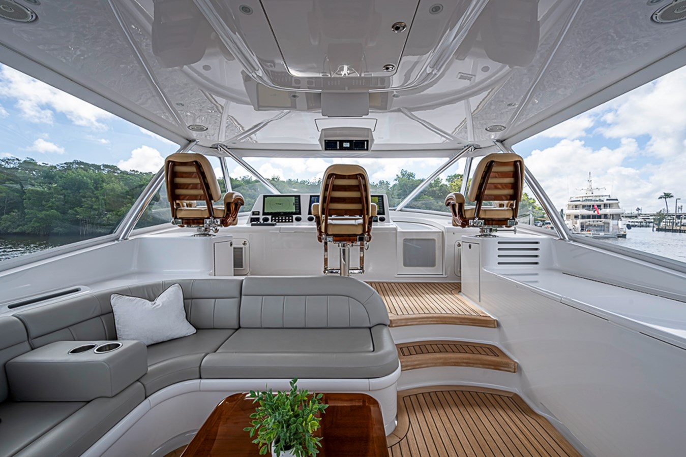This Express configuration keeps the captain connected to the Cockpit at all times, reinforcing the boat’s fish-first design while maintaining protection from the elements. Fit and finish throughout the Helm area dash work, upholstery, and hardware reflect true custom-yacht standards rather than production shortcuts.