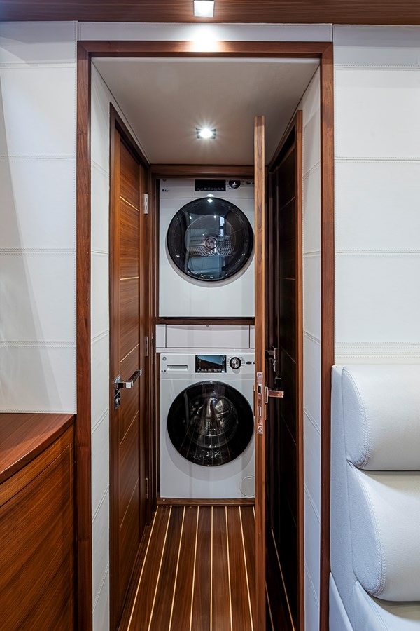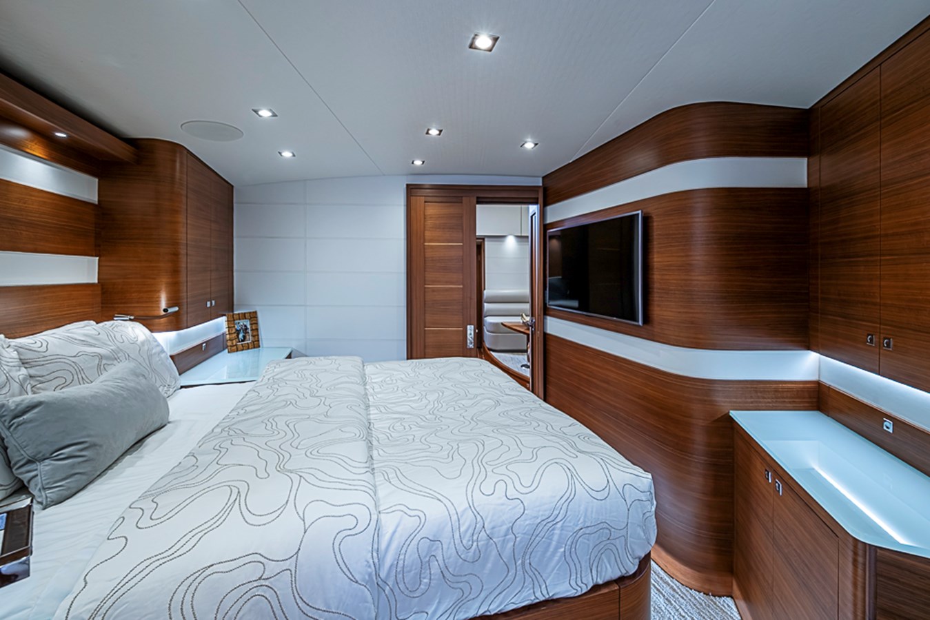 Below deck, the story continues with custom woodwork, premium materials, and a level of detail that immediately separates her from production builds. Every surface, system, and finish reflects thoughtful design and execution, resulting in a yacht that is as impressive at the dock as it is offshore.