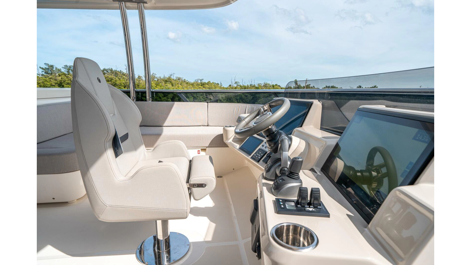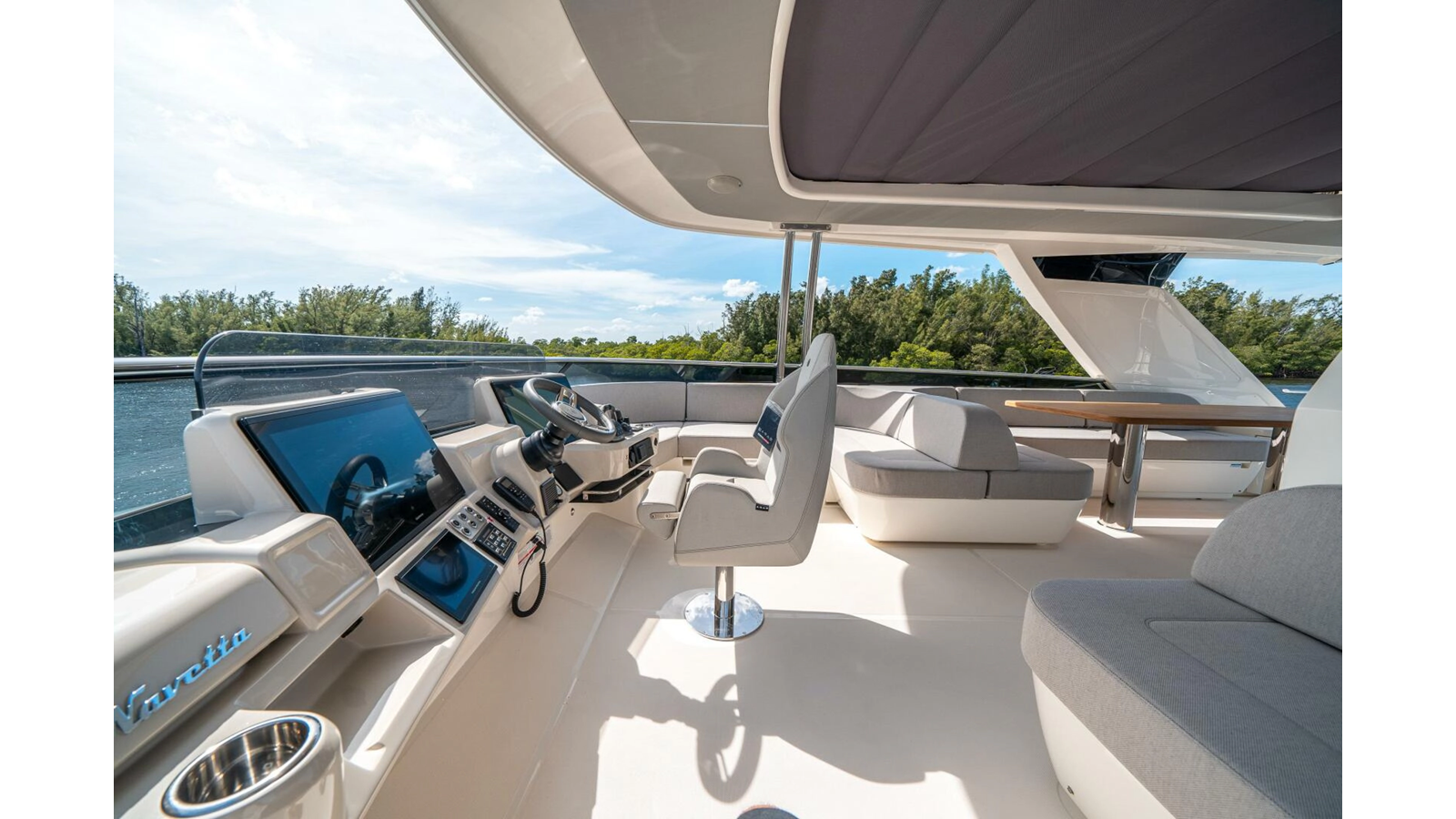 - In flybridge dashboard, Radio Stereo Fusion Radio with local volume control in the flybridge and bow area, with party mode connection with salon radio.