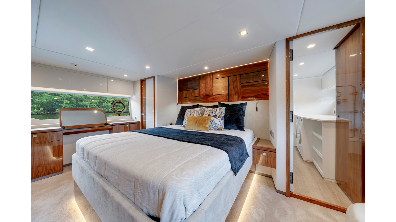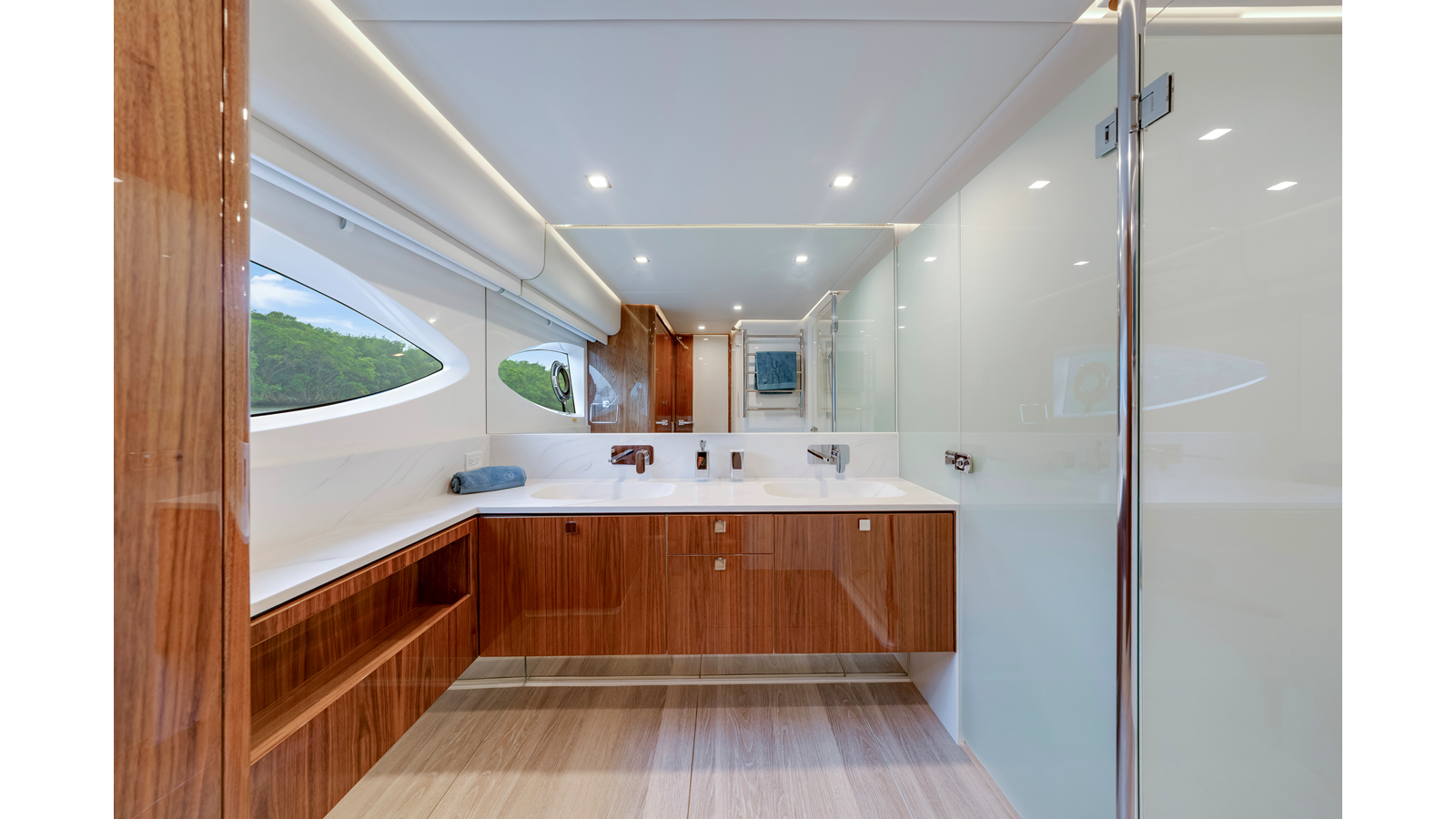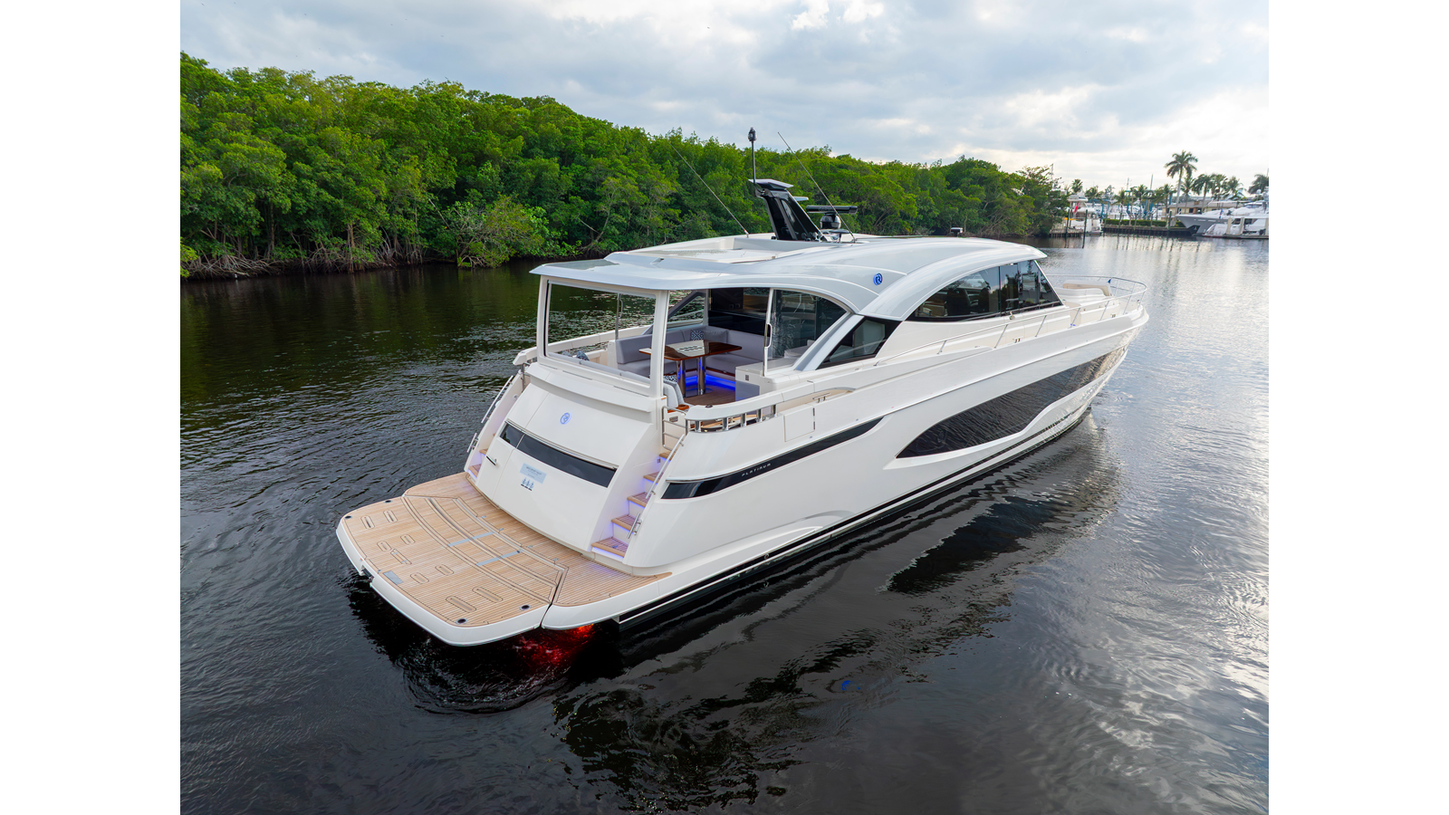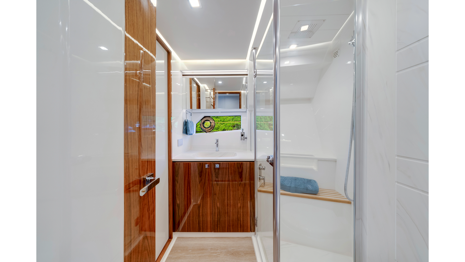 Perfect for a long-range adventure or a weekend away; with a choice of 3 or 4 staterooms and three bathrooms, a crew cabin or utility laundry, a full-height walk-through engine room and an impressive tender garage devoted to water sports.